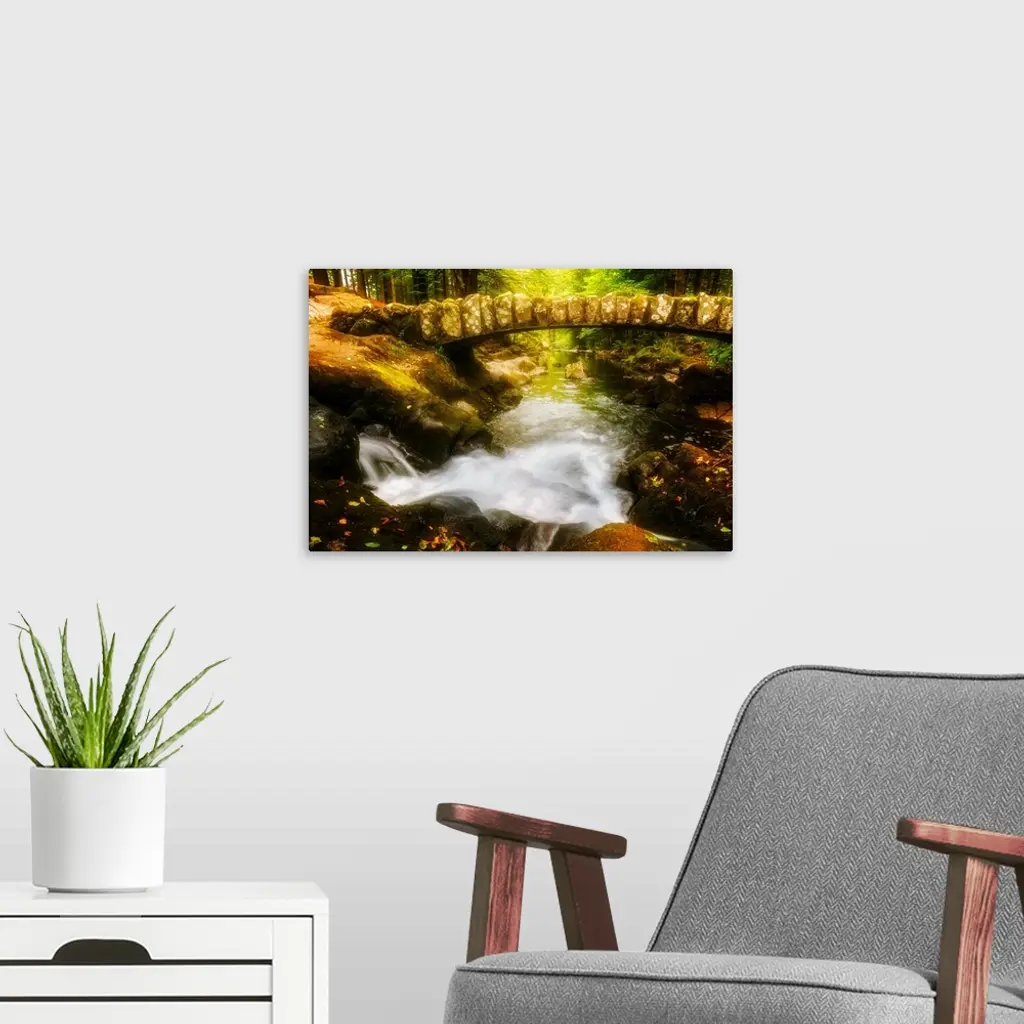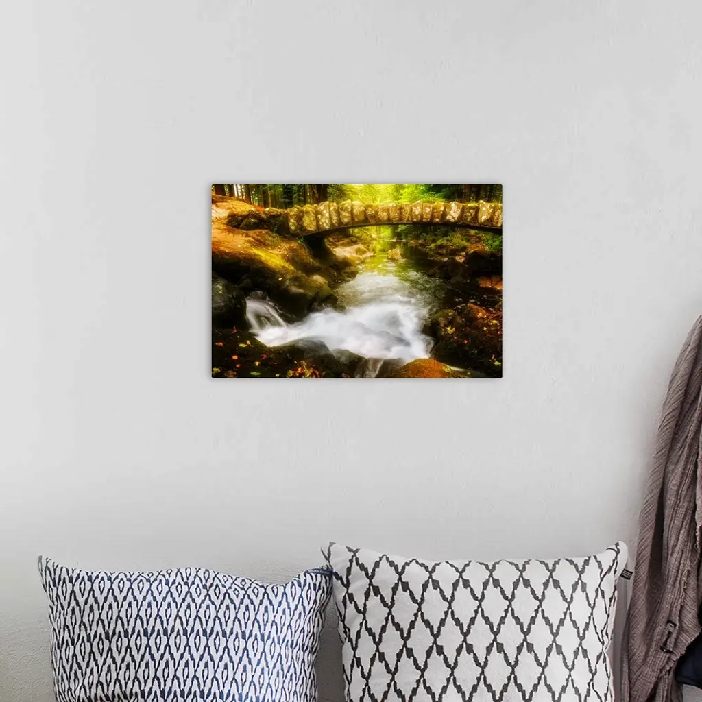 Old stone bridge over the Saut des Cuves (Waterfall of the Holes) in the forest near Gerardmer, France.