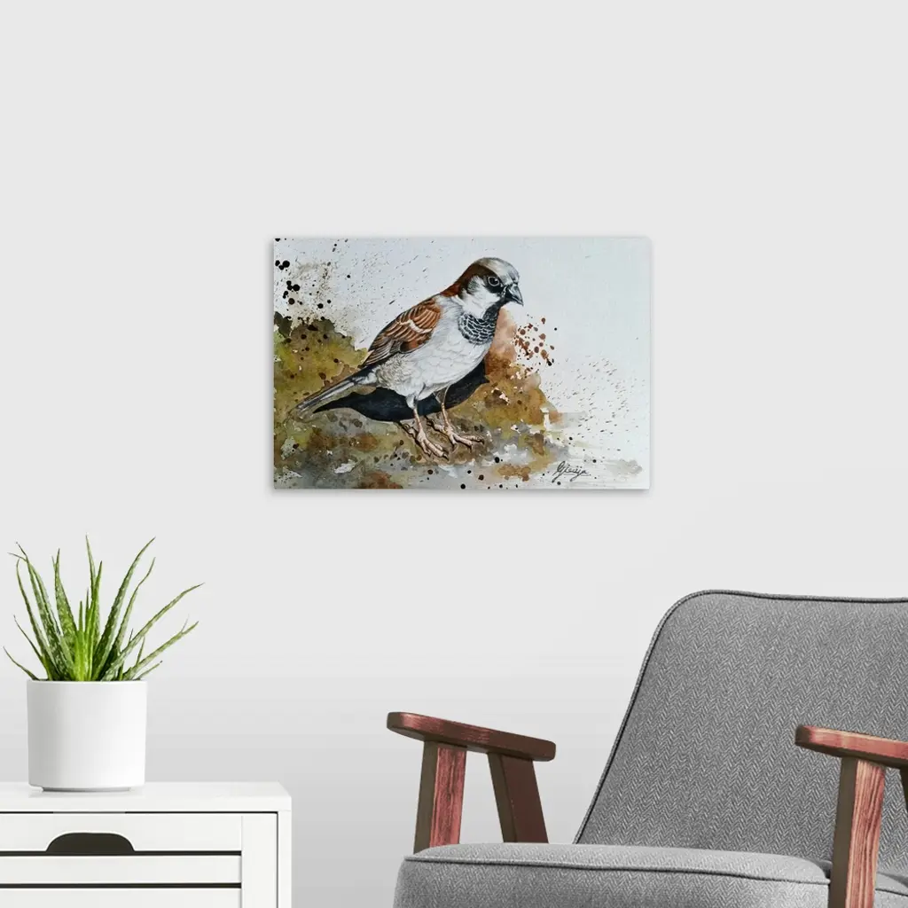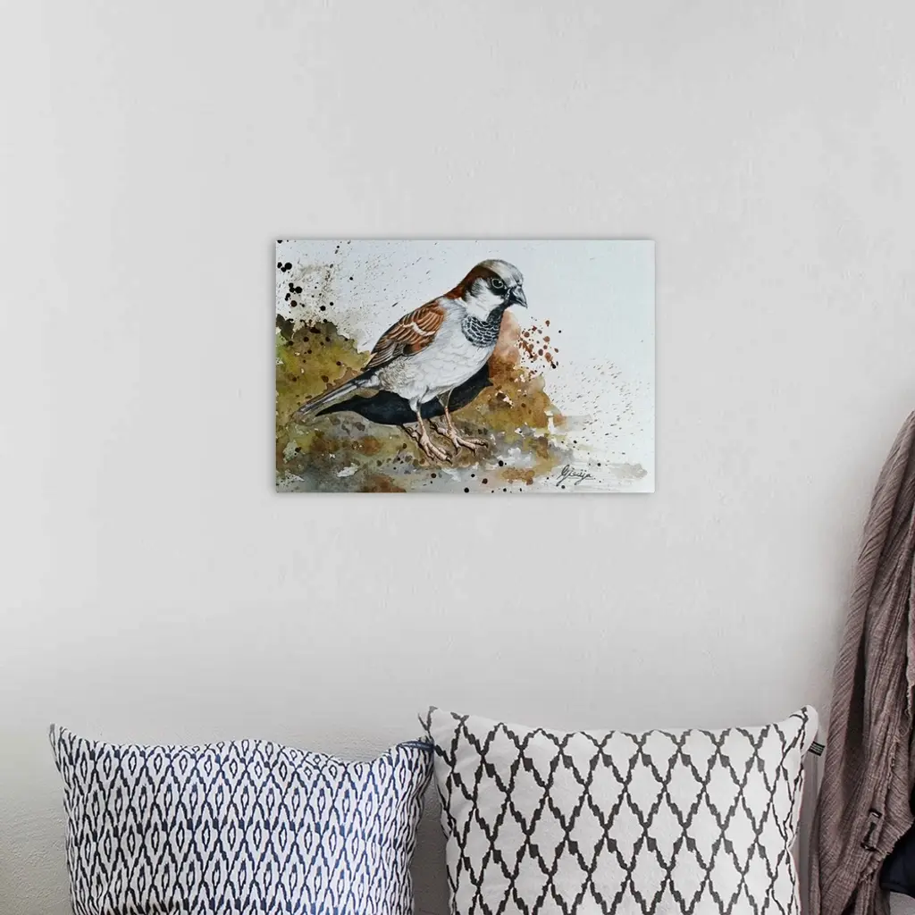 The house sparrow is a very common bird, found in most parts of the world. Electromagnetic radiation from mobile phones has a greater impact on house sparrow populations. Over the recent years, the house sparrow population has been on the decline in many Asian countries. Protecting insect habitats on farms and planting native plants in cities benefit the house sparrow, painted in watercolor on paper.