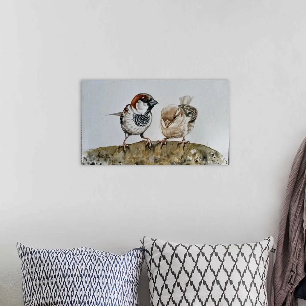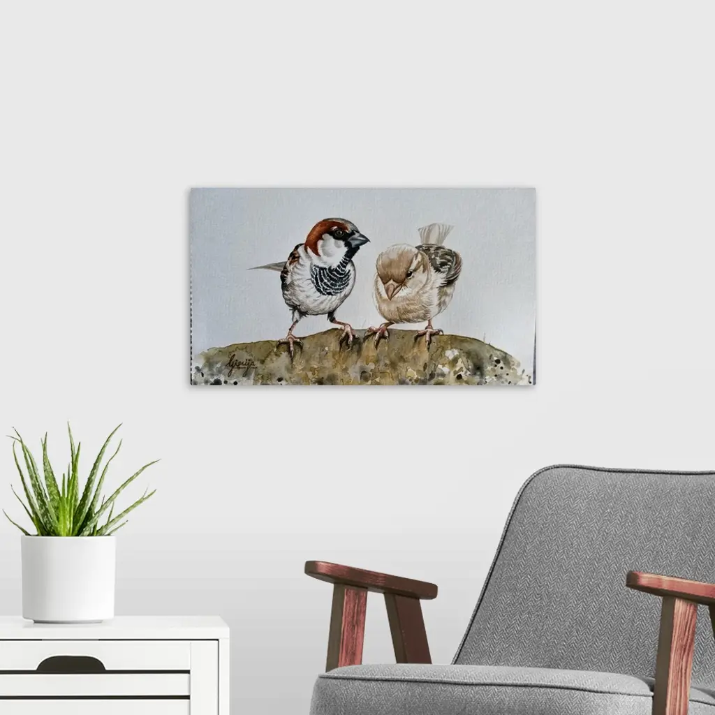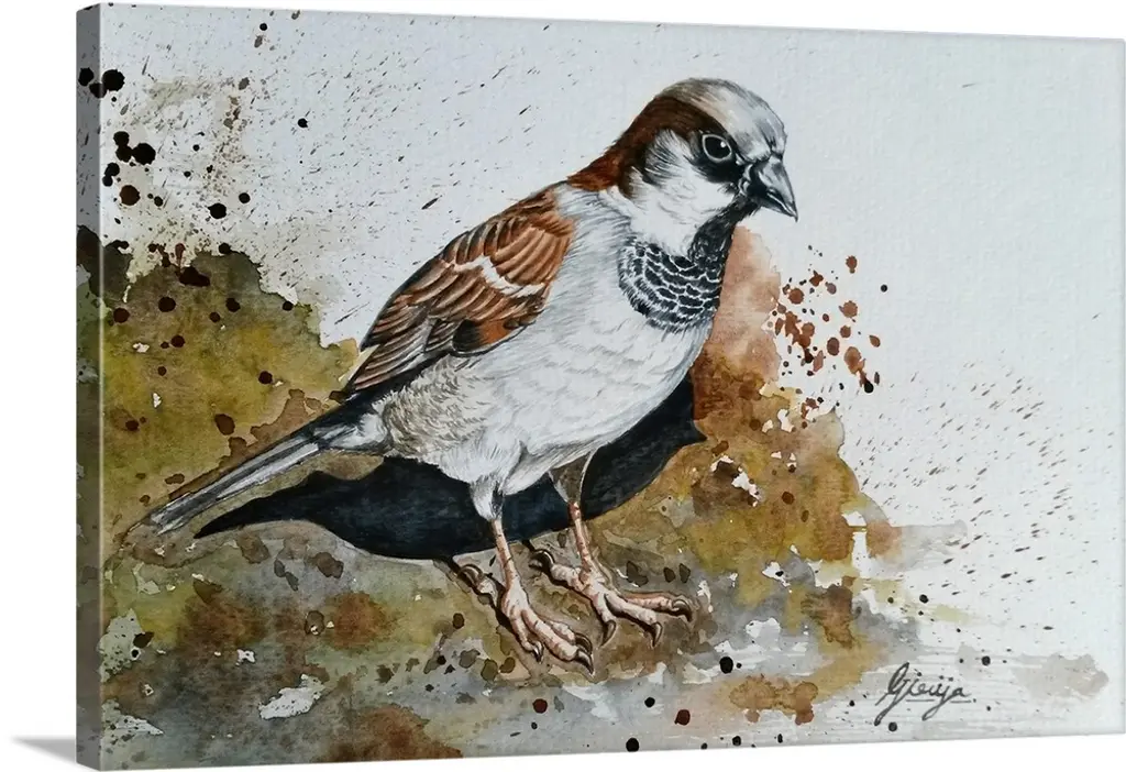 The house sparrow is a very common bird, found in most parts of the world. Electromagnetic radiation from mobile phones has a greater impact on house sparrow populations. Over the recent years, the house sparrow population has been on the decline in many Asian countries. Protecting insect habitats on farms and planting native plants in cities benefit the house sparrow, painted in watercolor on paper.