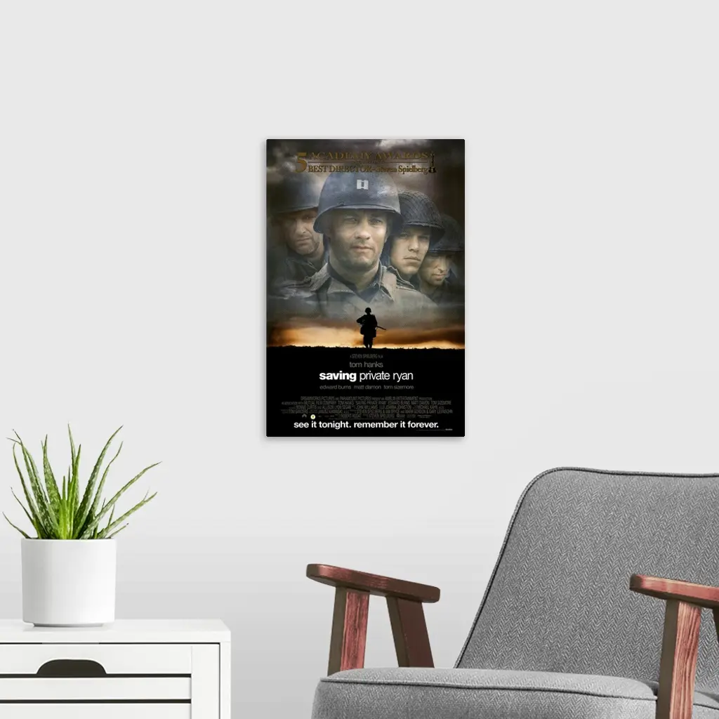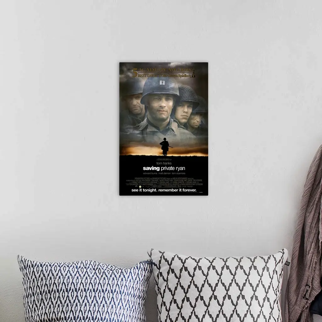 The classic movie poster for "Saving Private Ryan". There is a faded picture of the four main characters up top with a silhouette of a solider walking just below.