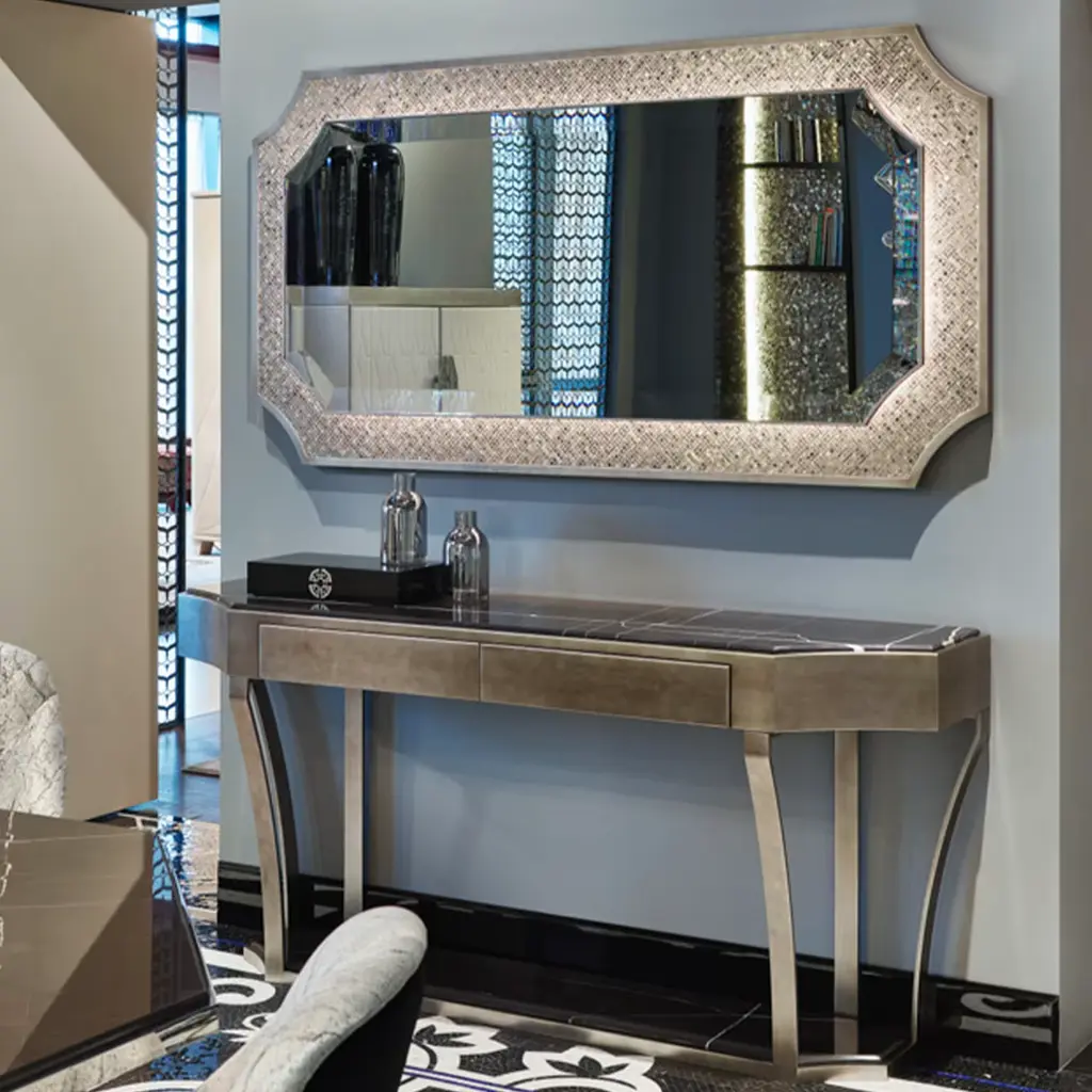 This delicate and refined console is an exquisite example of contemporary sophistication. It is characterized by a metal structure with a deco-shaped marble top.