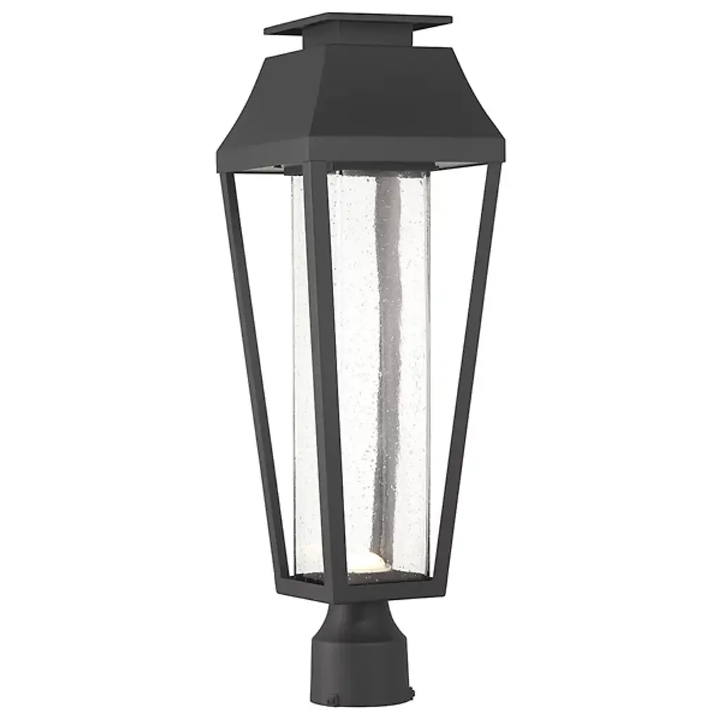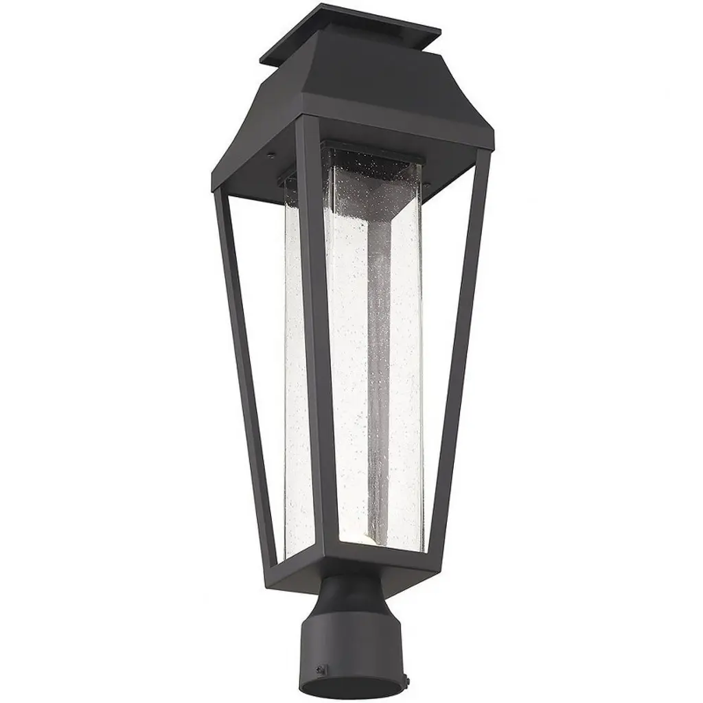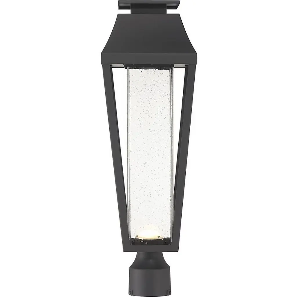 From Savoy House, the Brookline 1-light outdoor post light showcases a more contemporary take on classic lantern-style illumination with a central column of clear seeded glass illuminated by integrated LED light. The matte black finish adds versatility. Brookline is 22.50" in height and 7.25" in width. Material: Metal, Finish Color: Matte Black, Width: 7.25", Height: 22.5", Length: 7.25", Lamping Type: LED, Number Of Bulbs: 1, Wattage: 4.5 Watts, Cri: 90, Color Temperature: 3000 Kelvin, Lumens: 90, Dimmable: Yes, Moisture Rating: Wet Rated