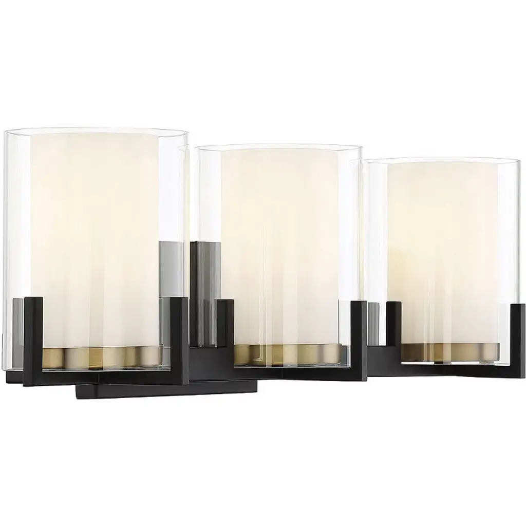 The Savoy House Eaton 3-light bath vanity light has an elegant and appealing look with shades of clear and white opal glass, jewelry-like prong detailing and a two-tone finish of black and brass. Create the illusion and beauty of candlelight with Eaton! This bath light is 7.5" in height, 24" in width and extends 7.5" from the wall. Uses three standard size bulbs of up to 60 watts per bulb. Damp area rated.