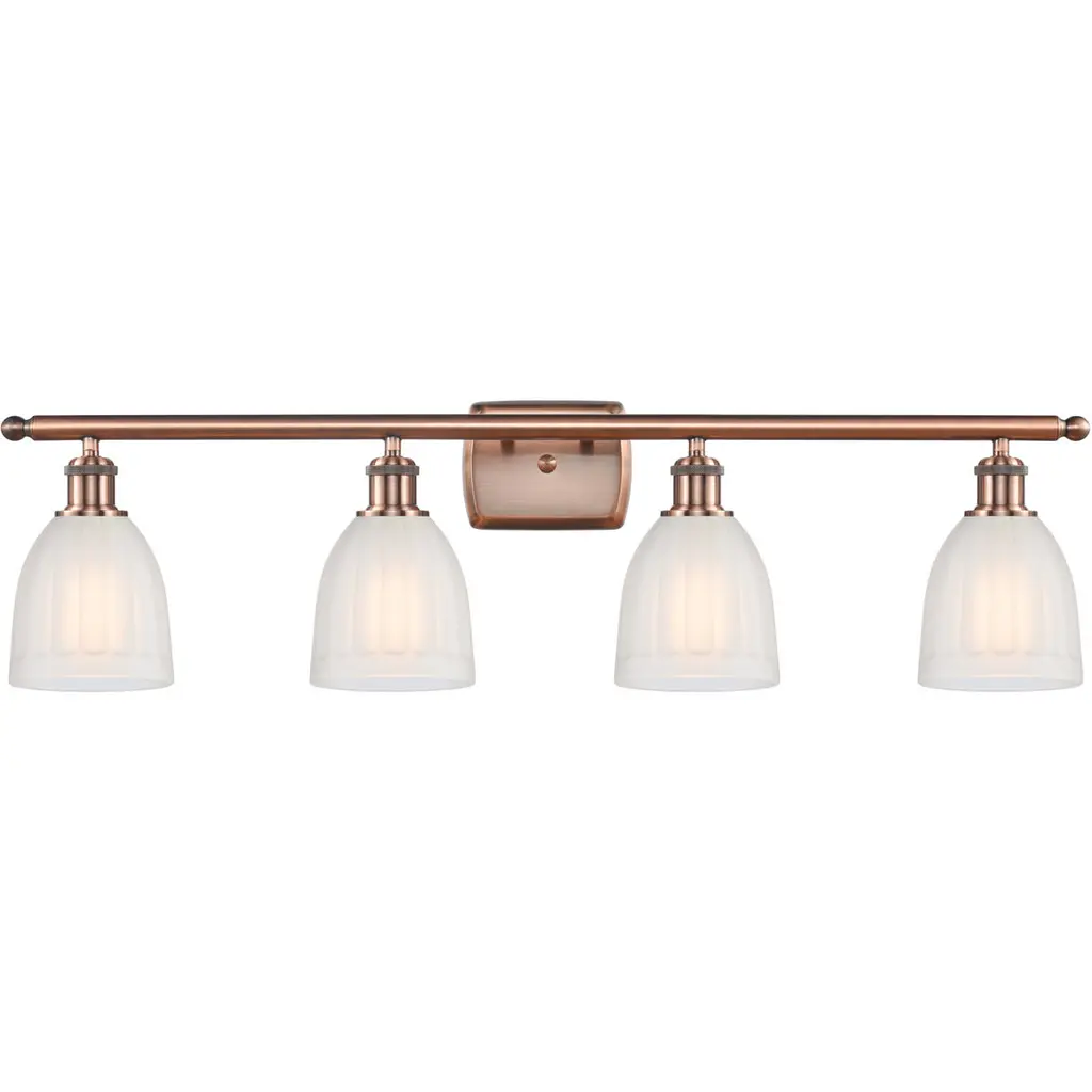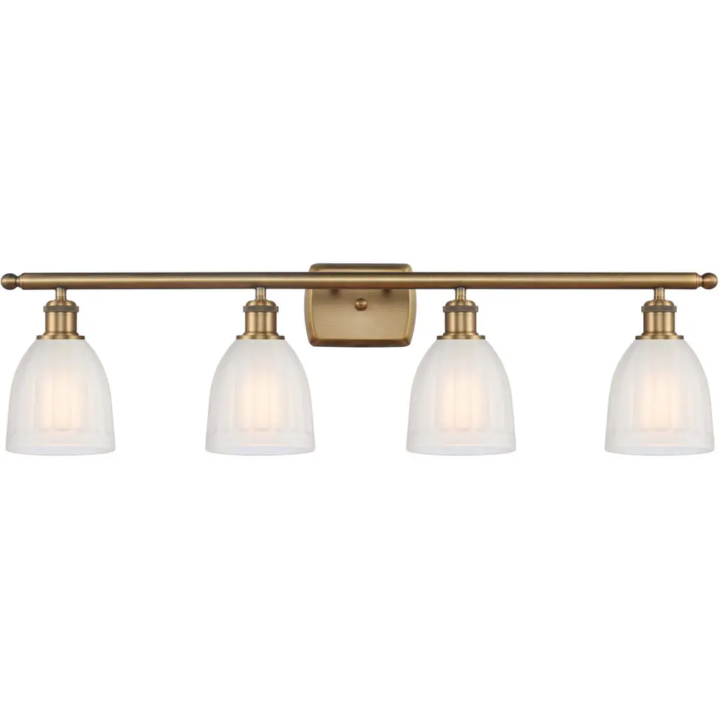 The Kaden 4-light bathroom vanity light from Savoy House has a classic look with a hint of industrial inspiration. White opal glass shades are held in place with eye-catching hardware that, like the bar and backplate, is finished in warm brass. Kaden is 10.5" in height, 34" in width and extends 7" from the wall. It uses four standard size bulbs with a max of 60 watts per bulb. Damp area rated.