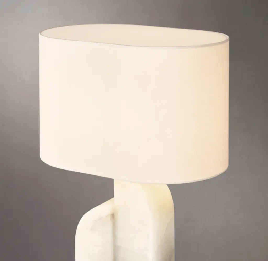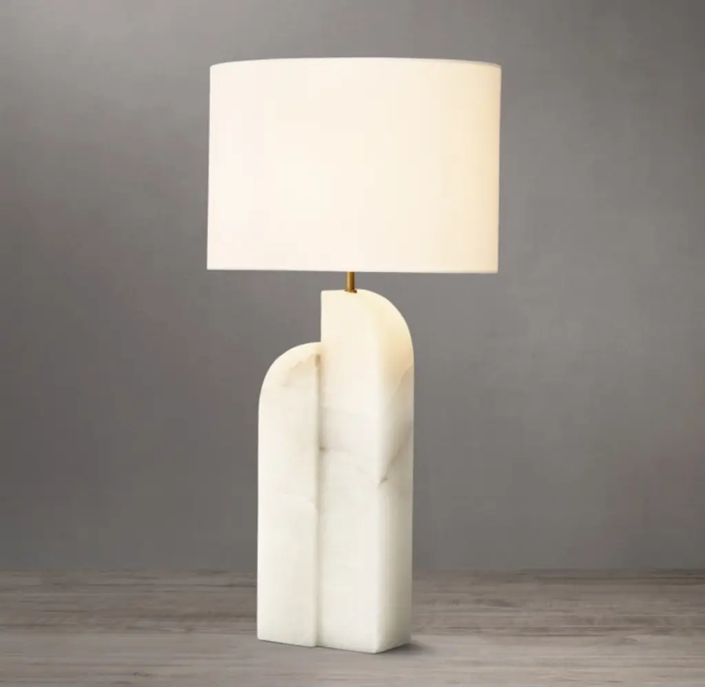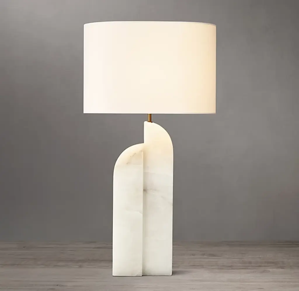 Handcrafted of honed alabaster or marble, the Savoye lamp combines two curved columns into one sculptural base, the staggered form calling to mind tectonic movement along a fault line. Informed by postmodernist design, the fixture casts warm, directional light down through the translucent stone.