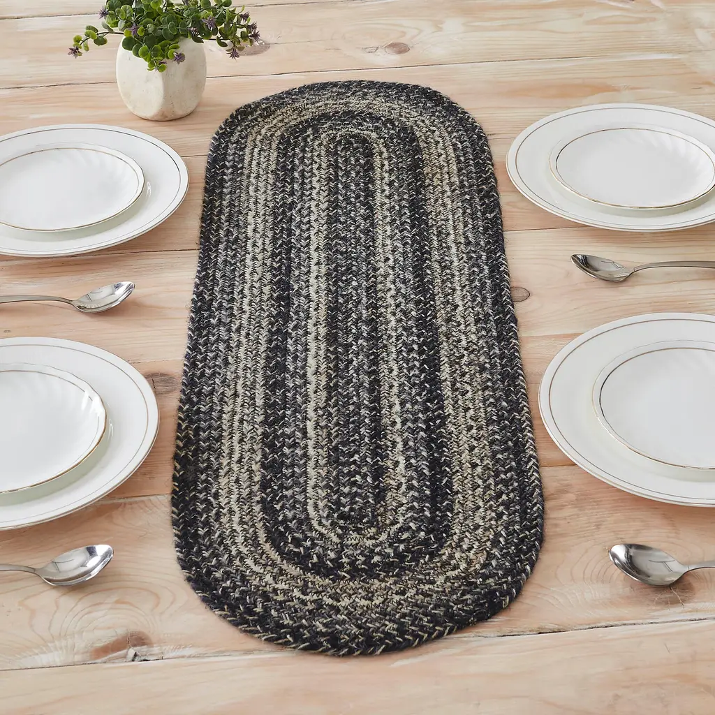 FARMHOUSE TABLE RUNNER: Includes one 12x36 inch table runner for a perfectly prepped table with classic country charm.,JUTE BLEND: This rustic table runner is constructed with tightly woven braids made of 80 percent jute and 20 percent cotton and other fibers for a heavier runner that relaxes faster and stays flat.,MODERN FARMHOUSE FLAIR: Versatile styling sure to match country chic, farmhouse, or cottage decor.,EASY CARE: Spot clean with a clear, mild detergent.,BLACK & CREME WEAVE: Alternating braids of deep black, grey and soft creme add modern, durable style to any surface.,COORDINATING ACCESSORIES: The Sawyer Mill collection is relaxed and casual with mixed fabrics and patterns in neutral colors great for modern farmhouse or cottage-style decor. The collection features coordinated bedding, window treatments, rugs and more to provide everything you need to make your country farmhouse dreams a reality.,AUTHENTICITY: Sometimes copied, never duplicated. VHC products ALWAYS feature attached product tags.