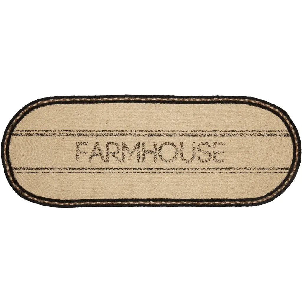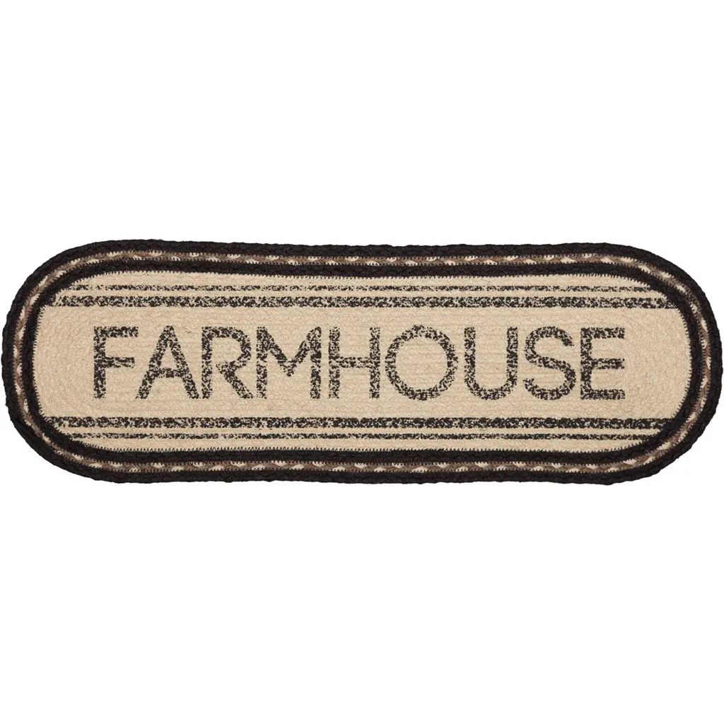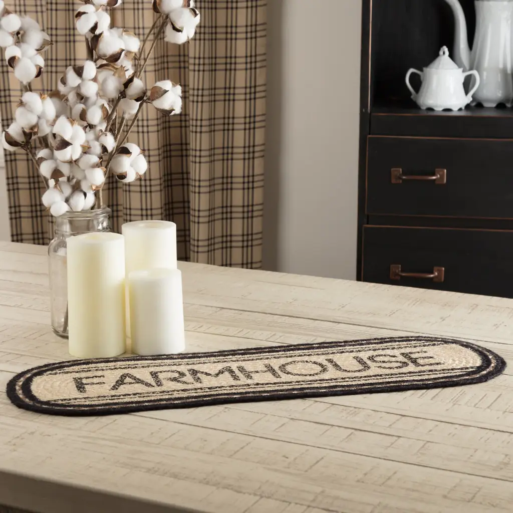 The Sawyer Mill Charcoal Farmhouse Jute Runner wears its heart on its sleeve. A distressed black stenciled Farmhouse is among concentric braids of black, grey taupe, silver, and ivory with a beautiful solid ivory center. Grain sack stripes are displayed above and below the wording.Features PREMIUM CONSTRUCTION: with over two decades experience crafting goods for American homes, our items are built to last for years to come.FARMHOUSE DECOR: fits your farmhouse home with updated country style.QUALITY MATERIAL: made with durable 100% jute for a proper look and feel.FARMHOUSE: This braided table runner contains bleached jute center accented with black, bleached, silver, and grey taupe braided border, "Farmhouse" stenciled across center with grain sack stripes in distressed blackDURABLE & STRONG: Machine stitching holds braiding together even with increased wear and tearREVERSIBLE: Reverses to same as front but without stencilBRAIDED: Machine braided, Machine stitchedSpecifications Material: 100% JuteColors: Bleached White, Asphalt, Grey TaupeManufacturer Country: IndiaCare: Spot CleanSizes Available 8" x 24" - 0.4 lb13" x 36" - 1 lb13" x 48" - 1.3 lb* To prevent colors from bleeding do not use chemicals or wet clean this item. A rug pad is recommended to keep your surfaces safe from color bleeding and abrasiveness of the jute fibers.