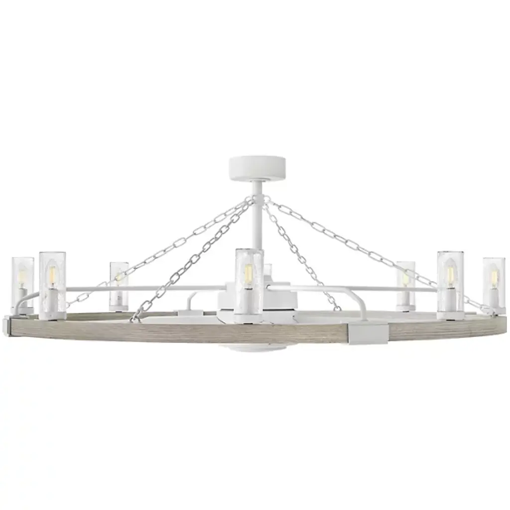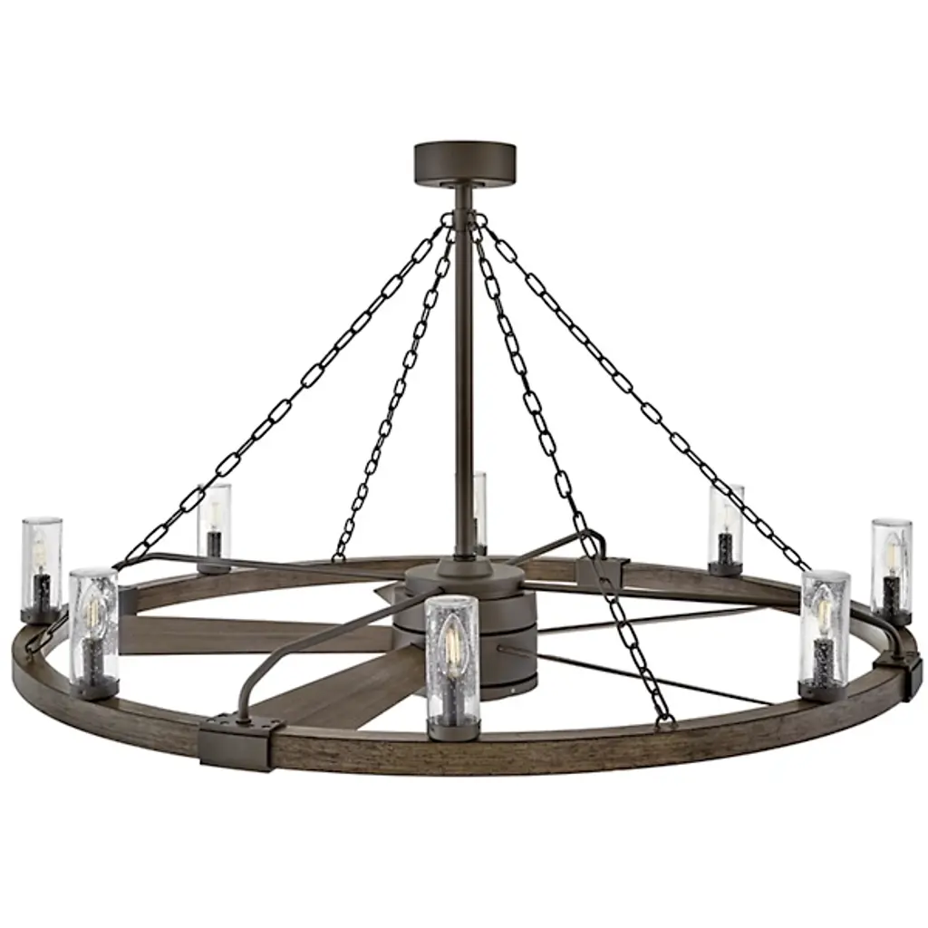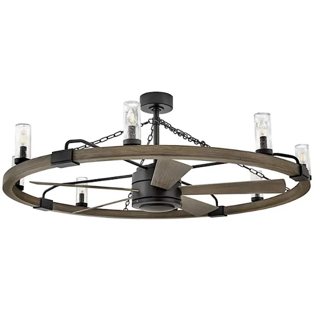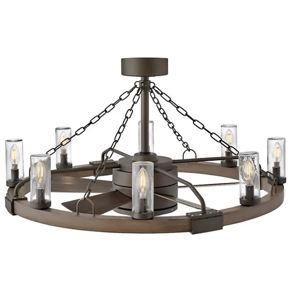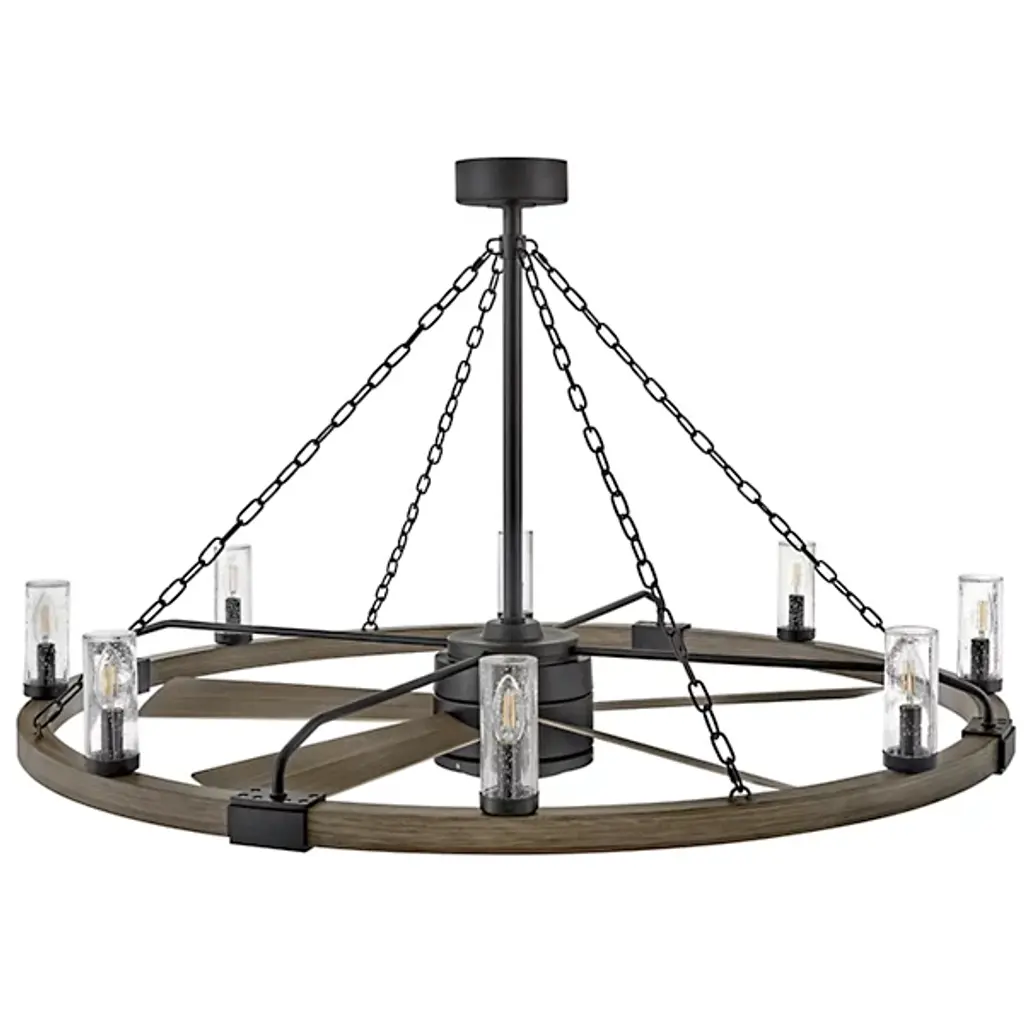 Bold, rustic, artisanal. Give your indoor-outdoor spaces a cool, cozy ambiance with the dual-function design of the Sawyer Smart Outdoor Fandelier from Hinkley. To fit seamlessly with a range of height ceilings, this piece comes equipped with a pair of adjustable downrods. The sloped ceiling adaptable piece creates an intriguing radial design amped up aesthetically by chain-links and rustic brackets. With charm brimming from its classic clear seeded glass shades, candelabra bulbs display beautifully, producing a warm, nurturing glow. Sleek composite blades circle the six-speed reversible motor. With an included wall control, these breeze-producing blades spin in perfect tempo, complementing the inviting light. Comes with Hinkley's HIRO smart fan control system allowing you to control your fan using a smartphone app or voice assistant like Amazon Alexa or Google Assistant.