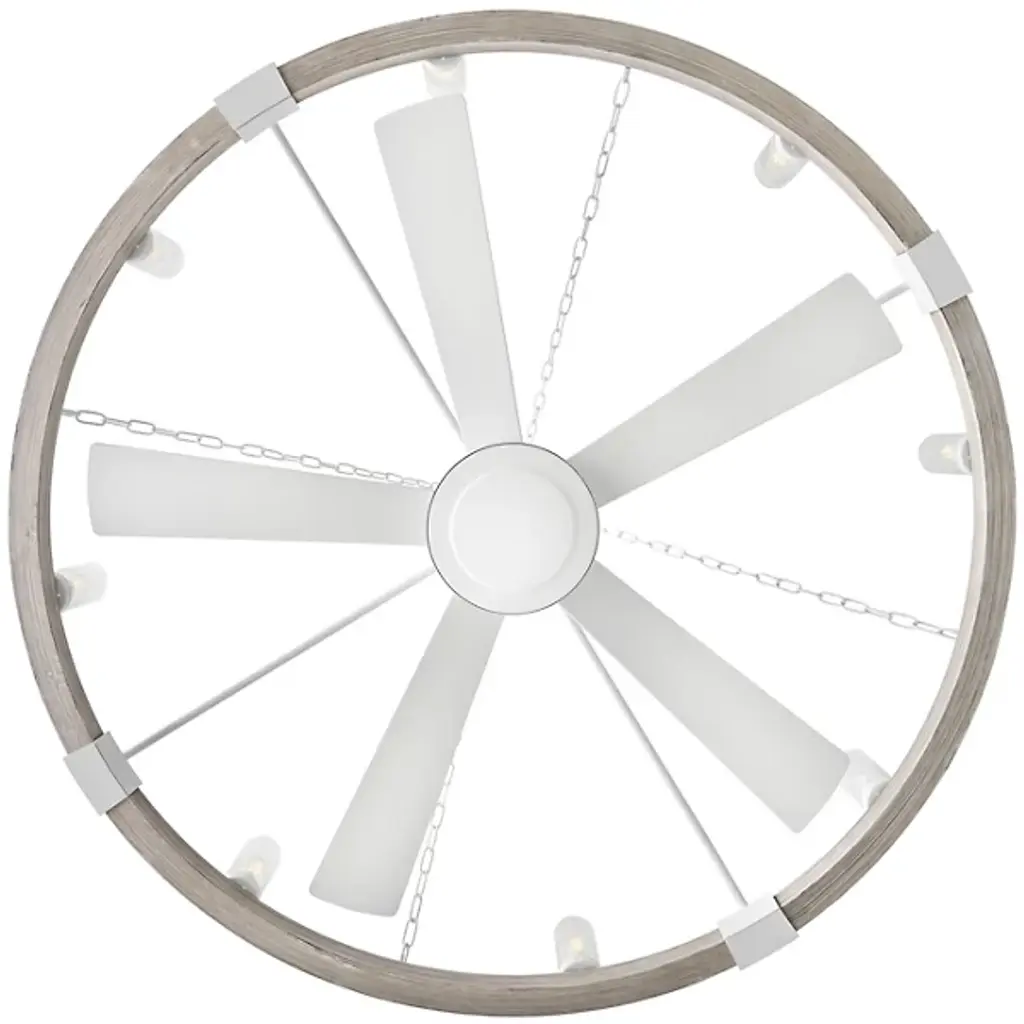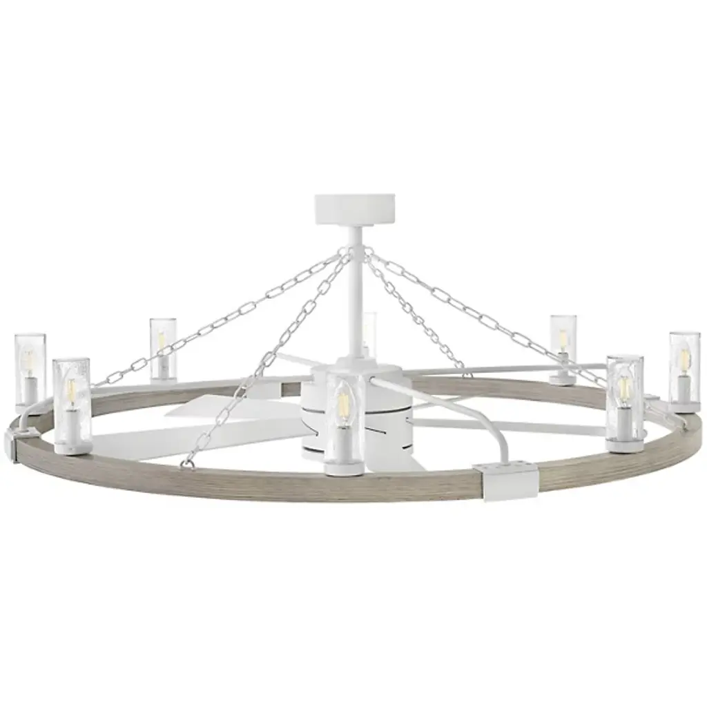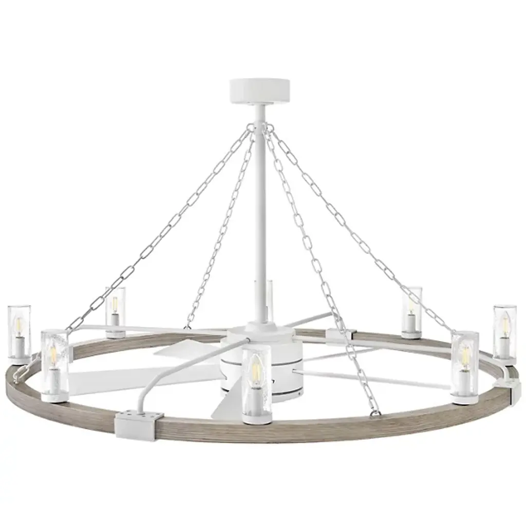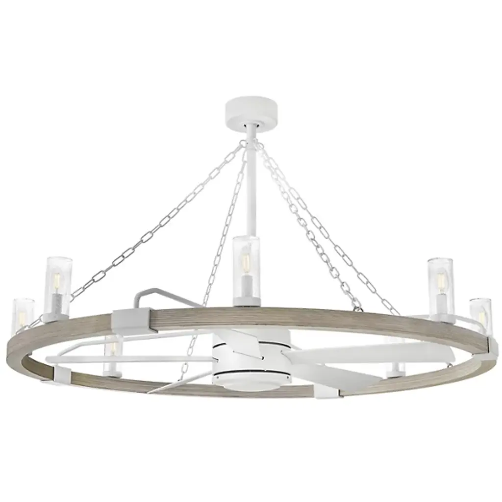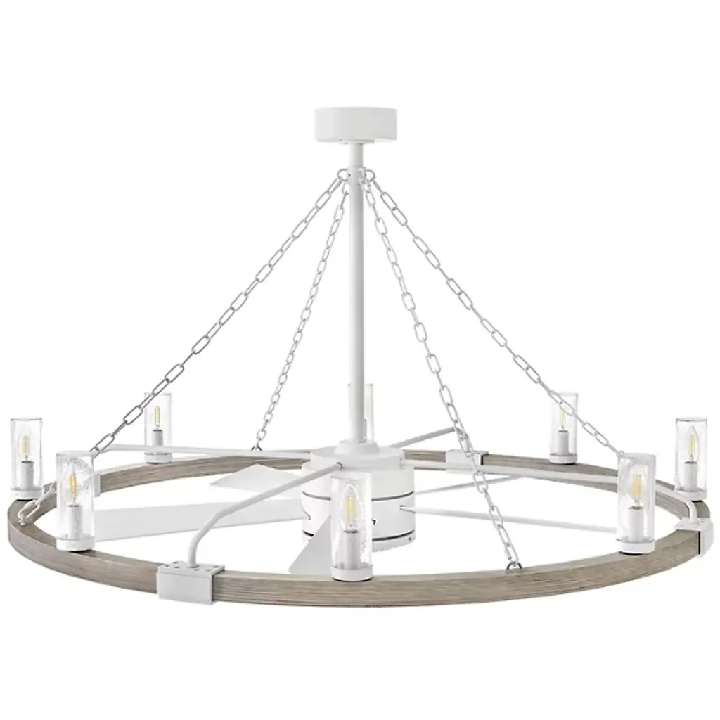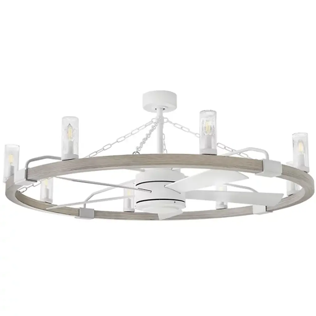 Bold, rustic, artisanal. Give your indoor-outdoor spaces a cool, cozy ambiance with the dual-function design of the Sawyer Smart Outdoor Fandelier from Hinkley. To fit seamlessly with a range of height ceilings, this piece comes equipped with a pair of adjustable downrods. The sloped ceiling adaptable piece creates an intriguing radial design amped up aesthetically by chain-links and rustic brackets. With charm brimming from its classic clear seeded glass shades, candelabra bulbs display beautifully, producing a warm, nurturing glow. Sleek composite blades circle the six-speed reversible motor. With an included wall control, these breeze-producing blades spin in perfect tempo, complementing the inviting light. Comes with Hinkley's HIRO smart fan control system allowing you to control your fan using a smartphone app or voice assistant like Amazon Alexa or Google Assistant.