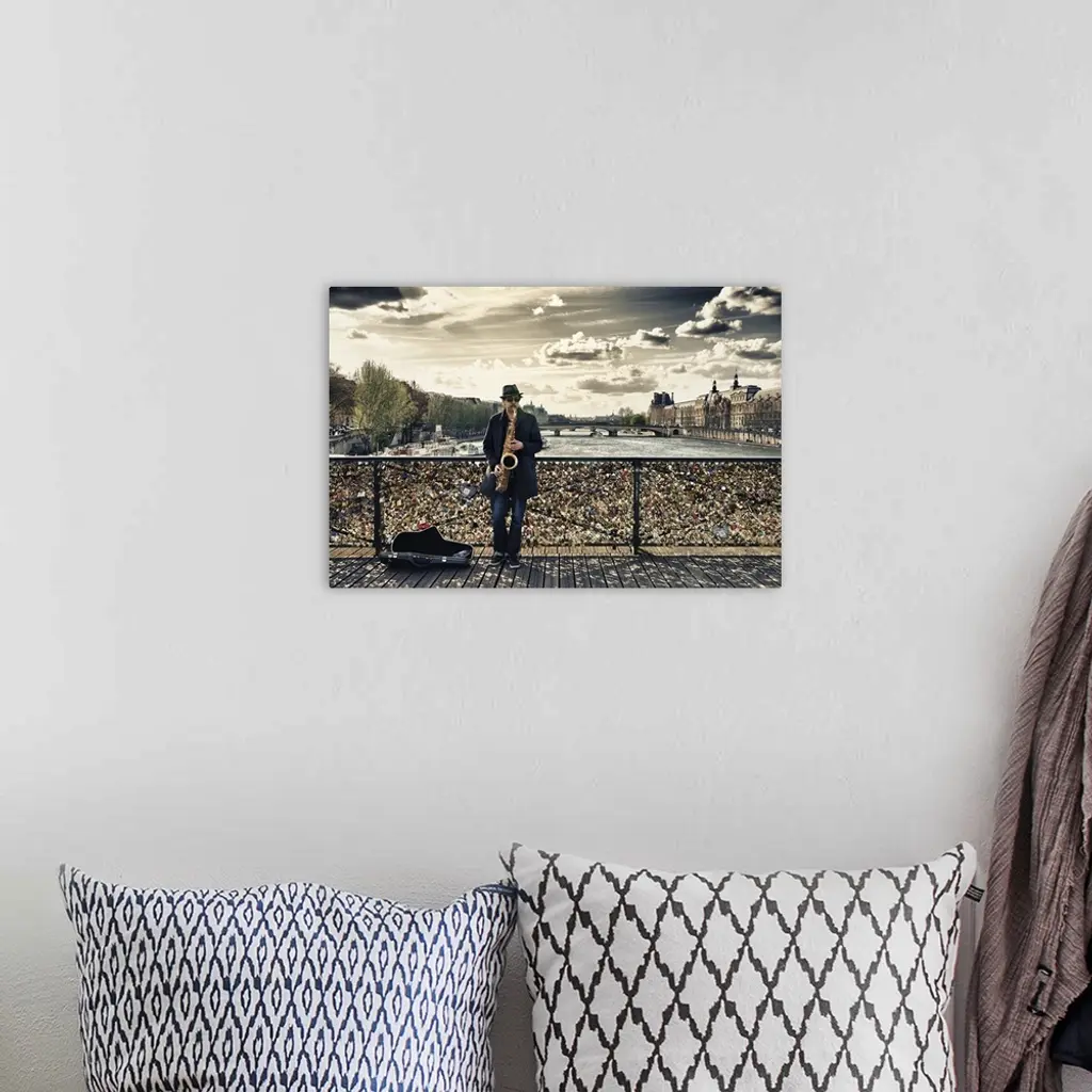 Fine art photo of a man playing the saxophone on bridge covered in locks in Paris, France.