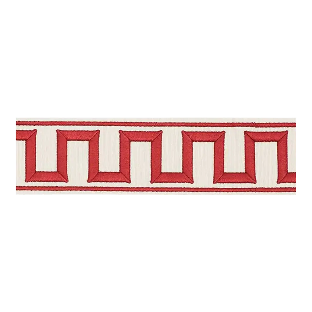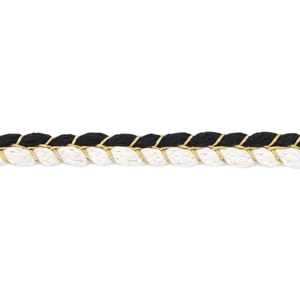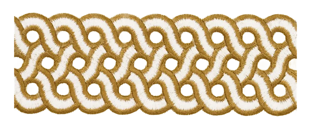 The pattern on this tape is inspired by a double helix, creating a delicately braided pattern that is embroidered on a finely woven faille tape. The 2" width is ideal for banding pillows, shades and curtains for a subtle accent of pattern and color. Material: Tapes