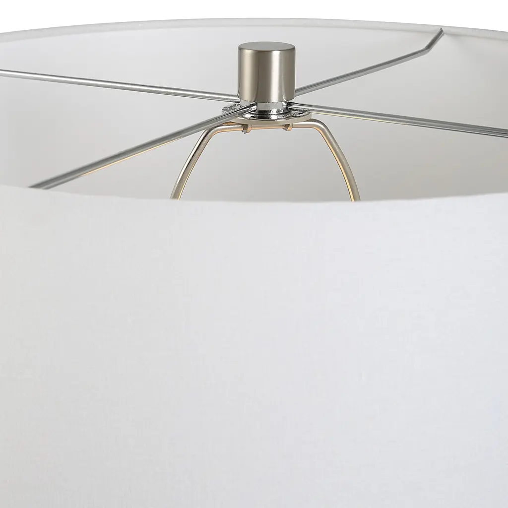 Charming lamp features a tapered ceramic base with softly scalloped sides, finished in a lightly distressed blue ombre accented by warm brown undertones along the edges. Plated brushed nickel details add a refined touch, enhancing its elegant silhouette. Topped with a slightly tapered drum shade in crisp white linen, it offers a clean, classic contrast. Due to the nature of fired glazes, each piece boasts slight variations, ensuring a one-of-a-kind finish that adds character to any space. Product Features: Scalloped sides design Plated brushed nickel finish Lamp uses (1) type-A 150 watt bulbs - not included Socket type: 3-way Switch type: socket switch UL listed for indoor use only Dimensions: Overall dimension: 32" high Shade height: 10" high Top diameter: 17" diameter Bottom diameter: 18" diameter Material(s): ceramic/iron/fabric