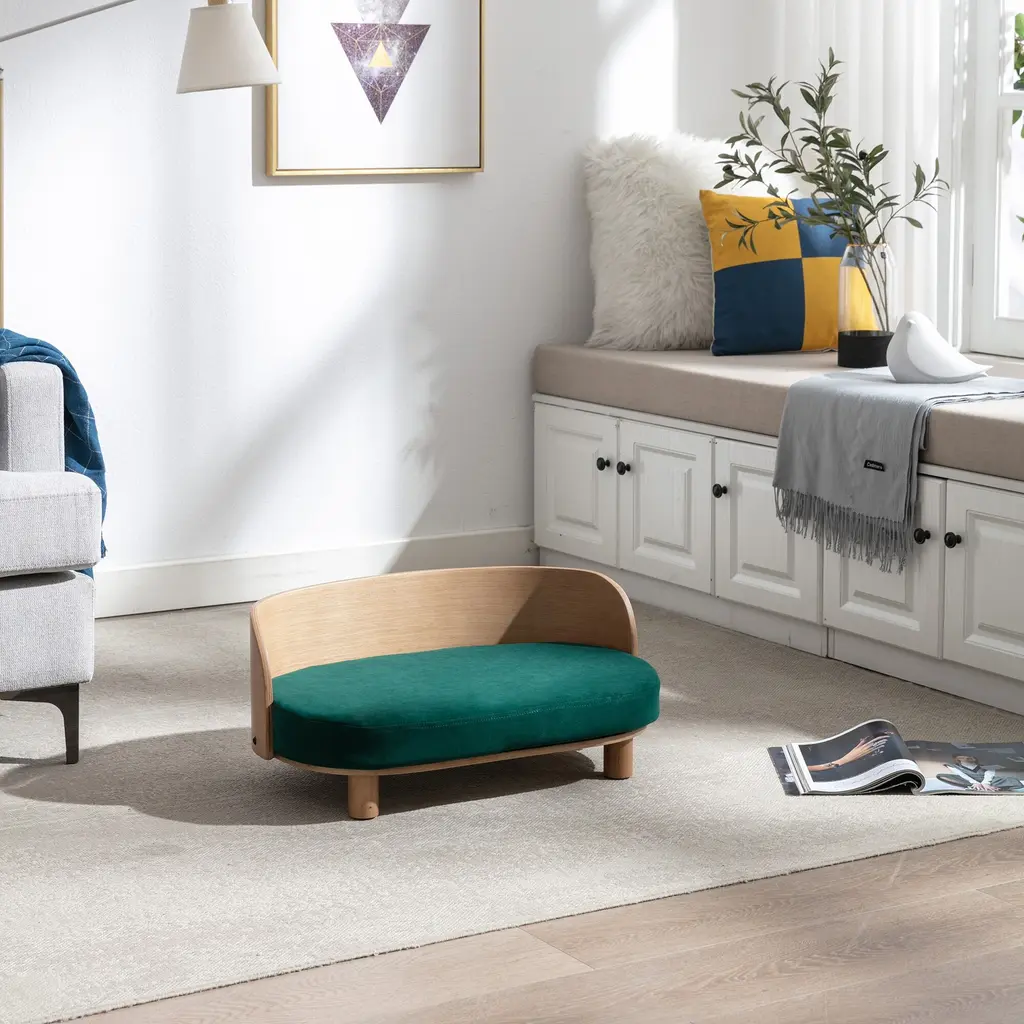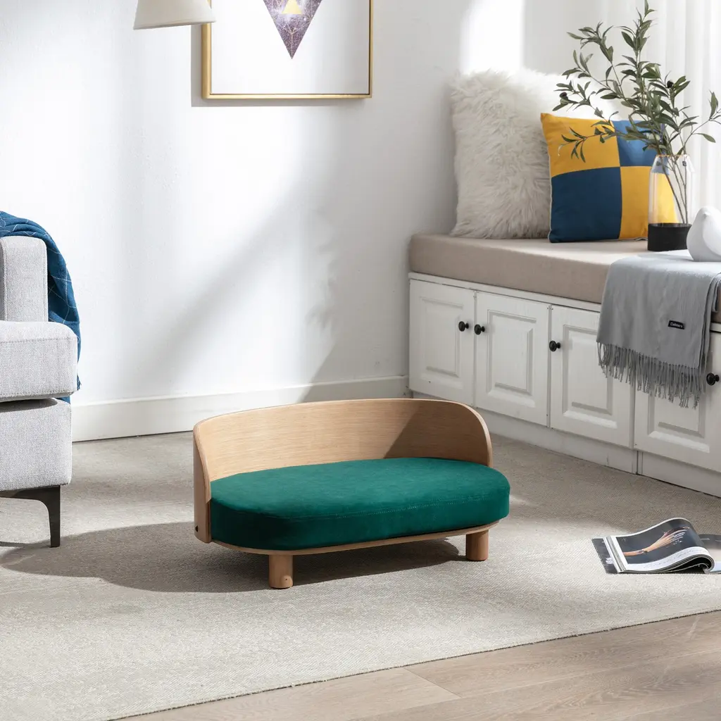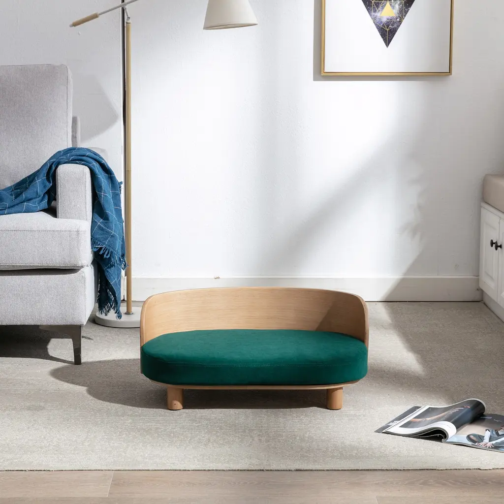 Scandinavian Style Elevated Dog Bed Pet Sofa With Solid Wood Legs And Bent Wood Back, Velvet Cushion - Green