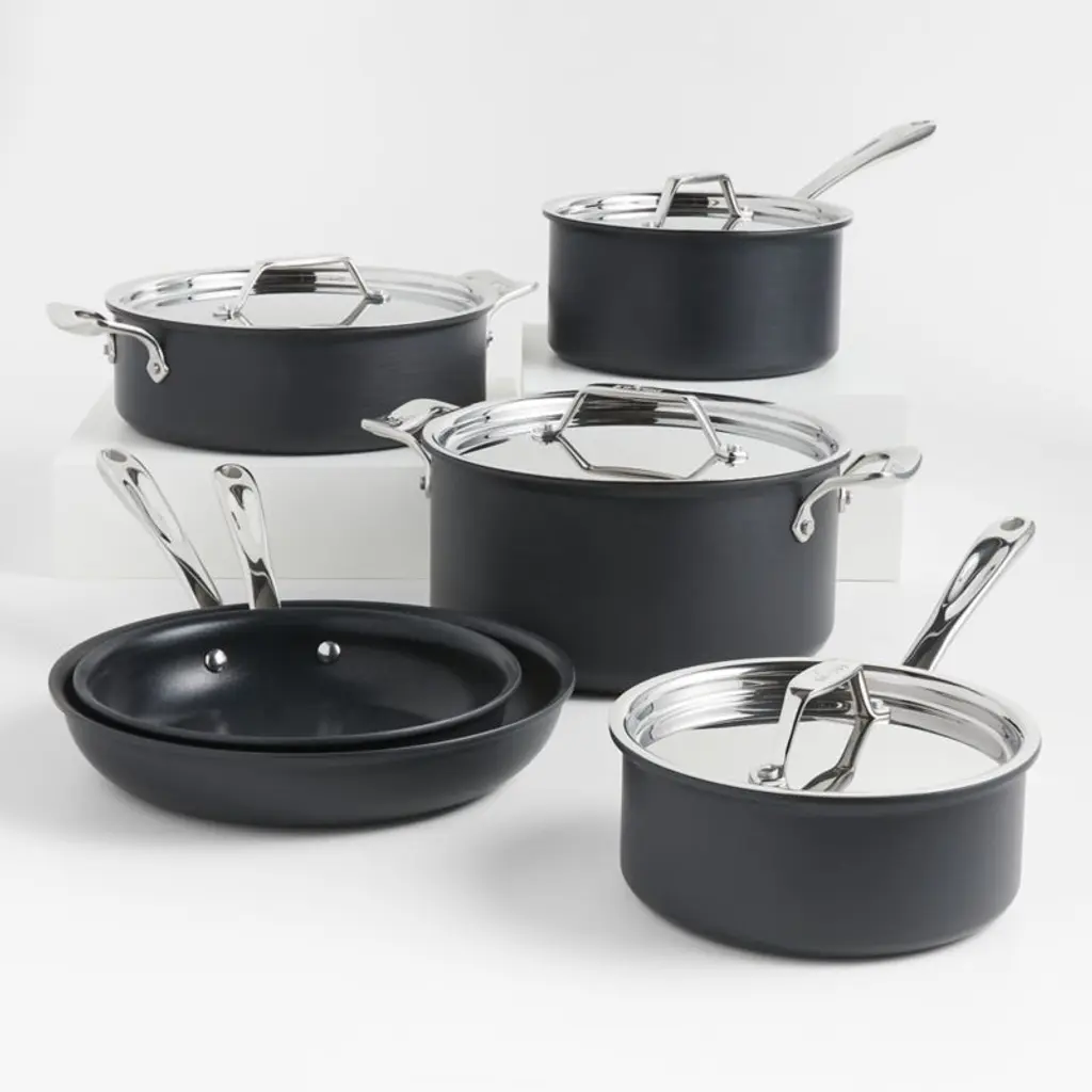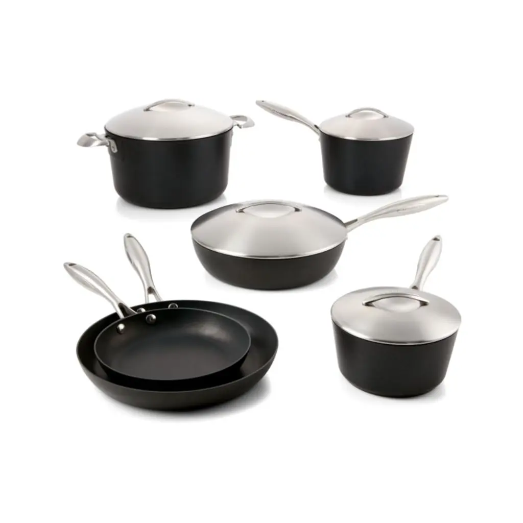 Enjoy upscale Danish design, eco-conscious construction, and professional performance for a lifetime. Handcast of recycled aluminum, the pots and pans in this set feature a Stratanium non-stick coating that's 10 times harder than steel. Each cookware item is designed with a thick base for uniform heat distribution, and features sturdy riveted cast stainless handles that add an extra touch of style, while staying cool.