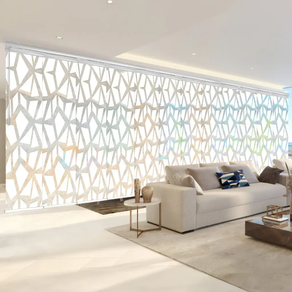Central Design Products is pleased to introduce a new innovative panel track that offers easy 2-way installation, adding an alluring style and refined touch to your home decor. The double rail design of the track is sleek, compact, and reduces the overall footprint and weight of the installation, eliminating bulky, intrusive window treatments. Adjusting the panel height is a breeze � simply trim the panel, re-attach the liner, and install the panel weight. Detailed instructions are included.The panel track also features a patented slider design, made with aluminum and fitted with bearings that allow for durable and smooth operation. The sliders are stacked closer together than conventional panel tracks, reducing light bleed coming from the gaps between panels. This track has endless uses from dividing rooms, garages, offices, and closets to decorating windows and patios. Available in smaller sizes including 3, 4, 5, 6, and 7 panels. Extends from 140-260� wide. Each panel measures 23.5" wide and 116" tall, with a total installation height of 118.5" (includes the 2.5" rail track). The track can be wall or ceiling mounted. The panels can stack on the left or the right. The clearance from the wall is extendable from 1.25� to 3.25� and projection from the wall is extendable from 3� to 4.25�. Scattered panel is made from 100% Polyester, with a light filtering shade that blocks 50% of the light.