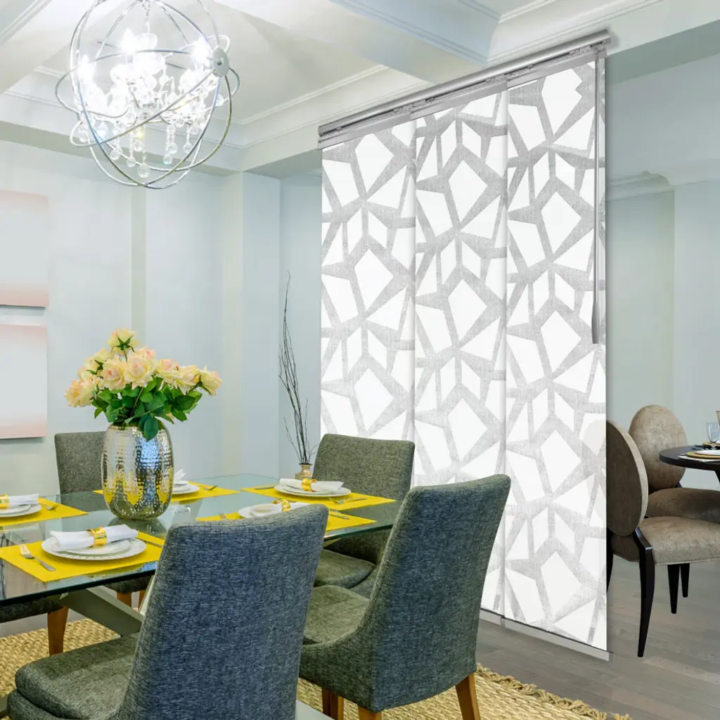 Central Design Products is pleased to introduce a new innovative panel track that offers easy 2-way installation, adding an alluring style and refined touch to your home decor. The single rail design of the track is sleek, compact, and reduces the overall footprint and weight of the installation, eliminating bulky, intrusive window treatments. Adjusting the panel height is a breeze � simply trim the panel, re-attach the liner, and install the panel weight. Detailed instructions are included.The panel track also features a patented slider design, made with aluminum and fitted with bearings that allow for durable and smooth operation. The sliders are stacked closer together than conventional panel tracks, reducing light bleed coming from the gaps between panels. This track has endless uses from dividing rooms, garages, offices, and closets to decorating windows and patios. Available in larger sizes including 8, 10, and 12 panels. Extends from 36-66� wide. Each panel measures 23.5" wide and 116" tall, with a total installation height of 118.5" (includes the 2.5" rail track). The track can be wall or ceiling mounted. The panels can stack on the left or the right. The clearance from the wall is extendable from 1.25� to 3.25� and projection from the wall is extendable from 3� to 4.25�. Scattered panel is made from 100% Polyester, with a light filtering shade that blocks 50% of the light.