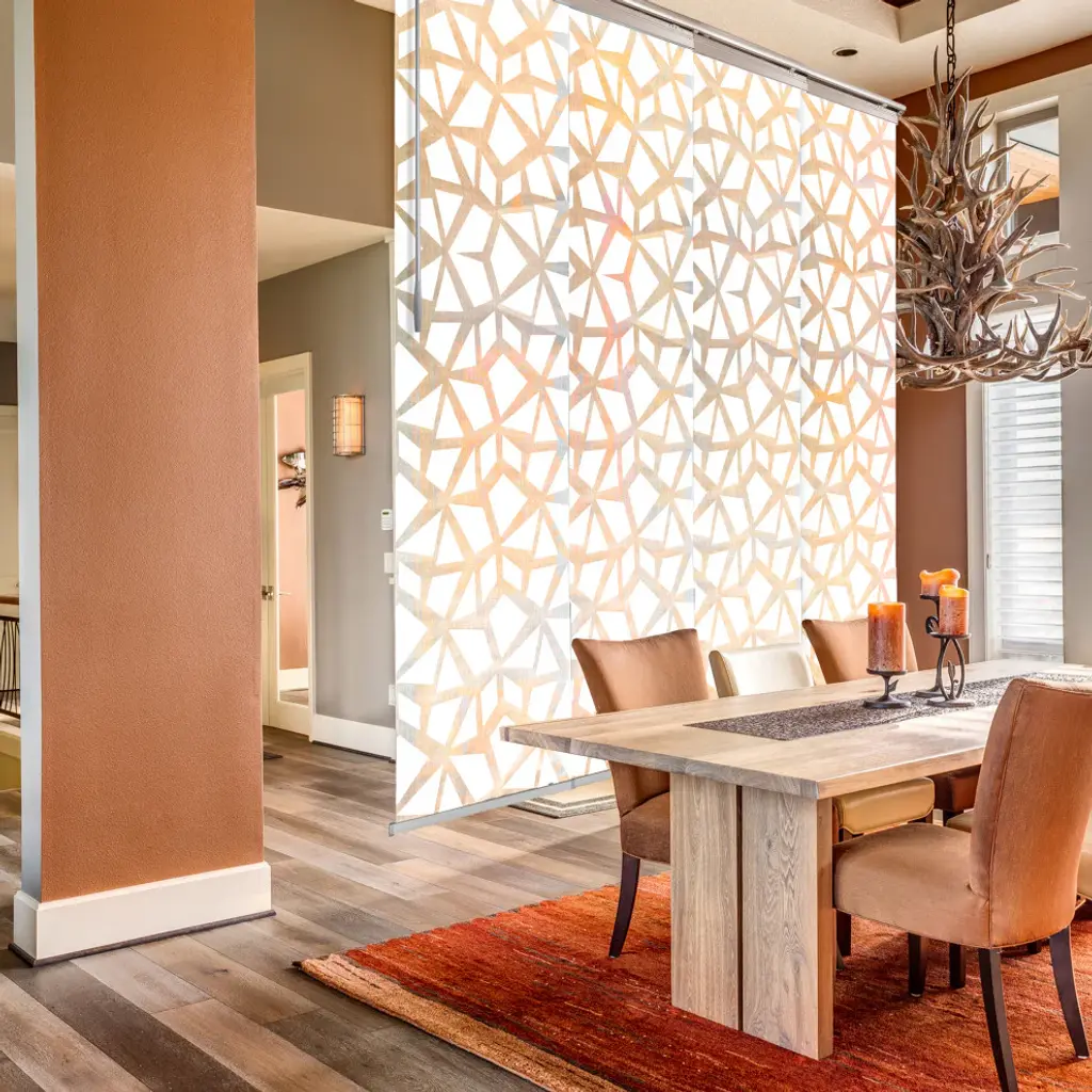 Central Design Products is pleased to introduce a new innovative panel track that offers easy 2-way installation, adding an alluring style and refined touch to your home decor. The single rail design of the track is sleek, compact, and reduces the overall footprint and weight of the installation, eliminating bulky, intrusive window treatments. Adjusting the panel height is a breeze � simply trim the panel, re-attach the liner, and install the panel weight. Detailed instructions are included.The panel track also features a patented slider design, made with aluminum and fitted with bearings that allow for durable and smooth operation. The sliders are stacked closer together than conventional panel tracks, reducing light bleed coming from the gaps between panels. This track has endless uses from dividing rooms, garages, offices, and closets to decorating windows and patios. Available in larger sizes including 8, 10, and 12 panels. Extends from 48-88� wide. Each panel measures 23.5" wide and 116" tall, with a total installation height of 118.5" (includes the 2.5" rail track). The track can be wall or ceiling mounted. The panels can stack on the left or the right. The clearance from the wall is extendable from 1.25� to 3.25� and projection from the wall is extendable from 3� to 4.25�. Scattered panel is made from 100% Polyester, with a light filtering shade that blocks 50% of the light.