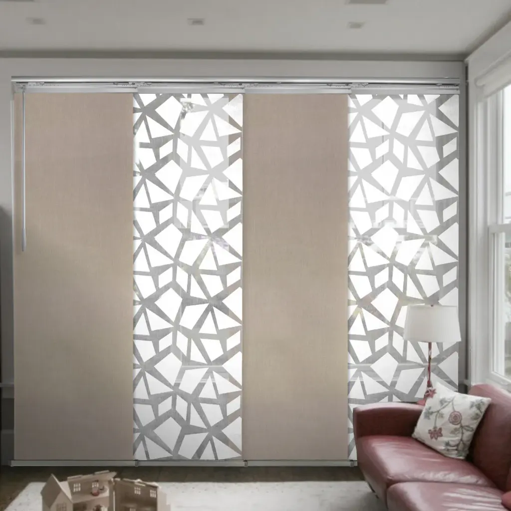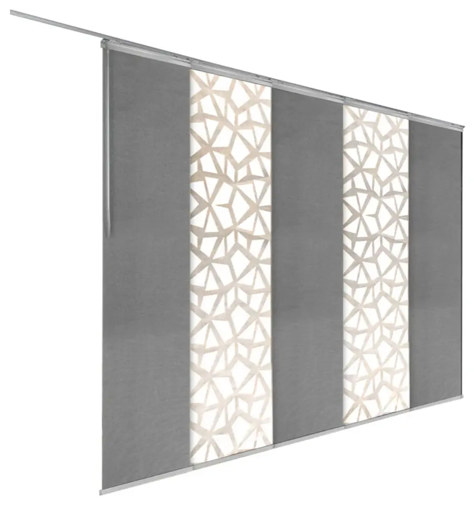 Central Design is pleased to announce the newly designed Panel Track, easily used as 2-way Vertical Blinds or Room Divider. Distinguished winner of the "2020 Good Design Award and 2021 MUSE Design Awards". Total Width is adjustable from 58-110". Individual Panel Size: 91.5" Height x 23.5" Wide. Overall Height including rail track is 94". The height of the Panel is adjustable by simply trimming the Panel and re-attaching the Liner and Panel Weight (Instructions provided). Wall or Ceiling mountable for versatility in its set up. Clearance (wall to the the back of Panel Track): extendable from 1.25"-3.25". Projection (wall to the furthest point): extendable from 3"-4.25". Single Rail Patented design; 1.25" thick for a very slick, thin, and compact design. No more bulky rail set ups. Made of steel for a durable and smooth operation of the Panels. Different from your standard panel track in that the sliders are designed in a more compact, overlapping fashion to reduce light bleed coming from in between the Panels. Track Material: steel. Panel Material: Polyester.More Panel Track sizes available & sold separately; 3-panel, 4-panel, 5-panel, 6-panel