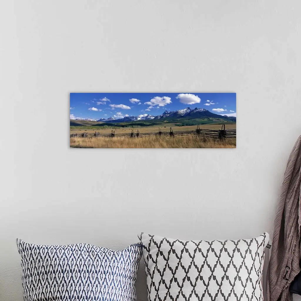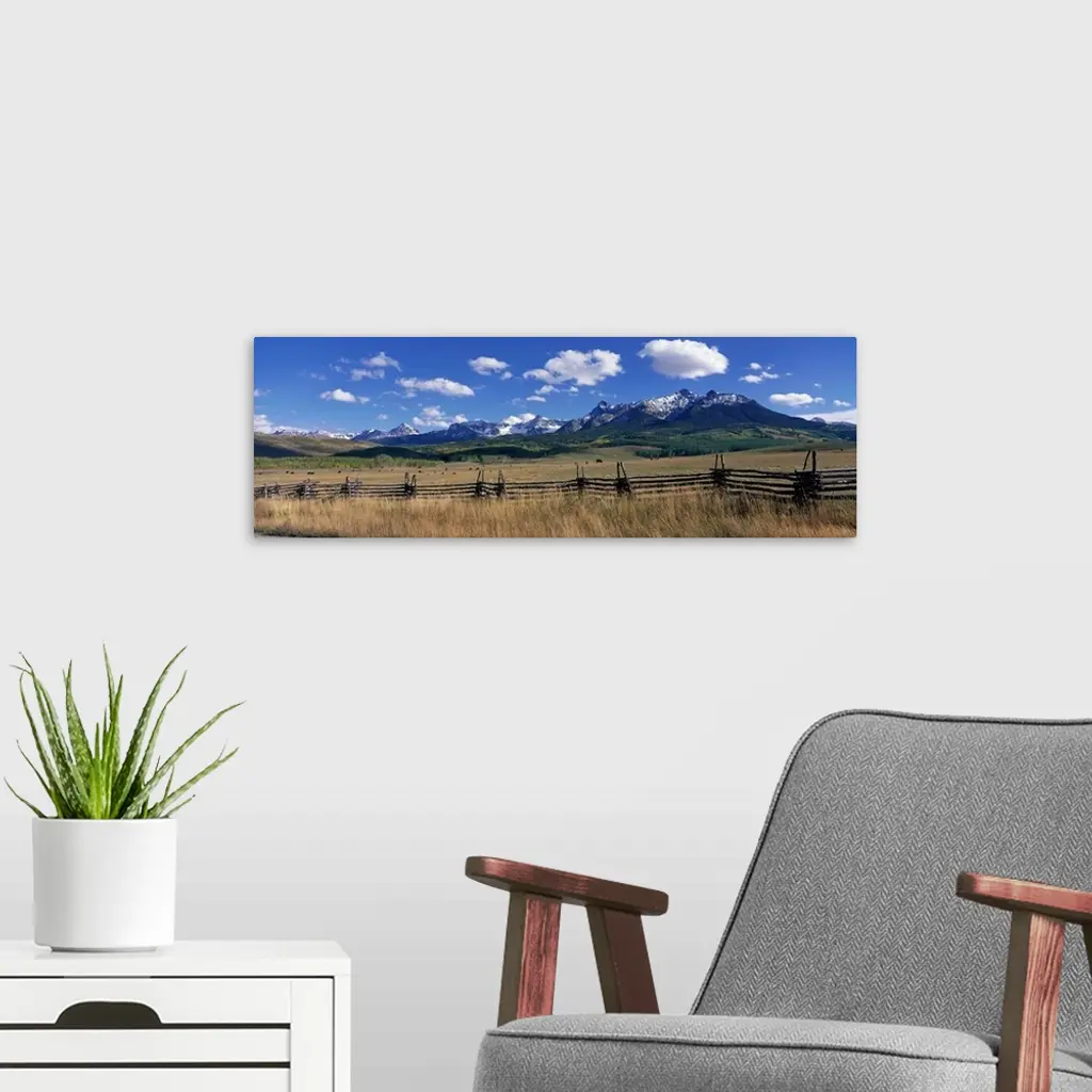Horizontal, large photograph of a distant mountain range beneath a bright blue sky, cattle grazing in the vast field, a fence runs horizontally in the foreground.