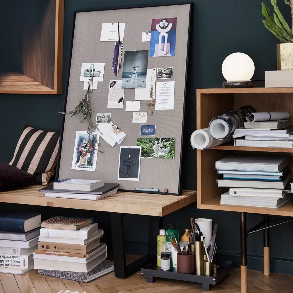 Stylishly organize your thoughts, inspirations and ideas with this pinboard series of a beautiful frame of black-stained ash wood with beige fabric on a cork base. These two components combined creates a raw and natural look, which is a nice fit in a modern home.