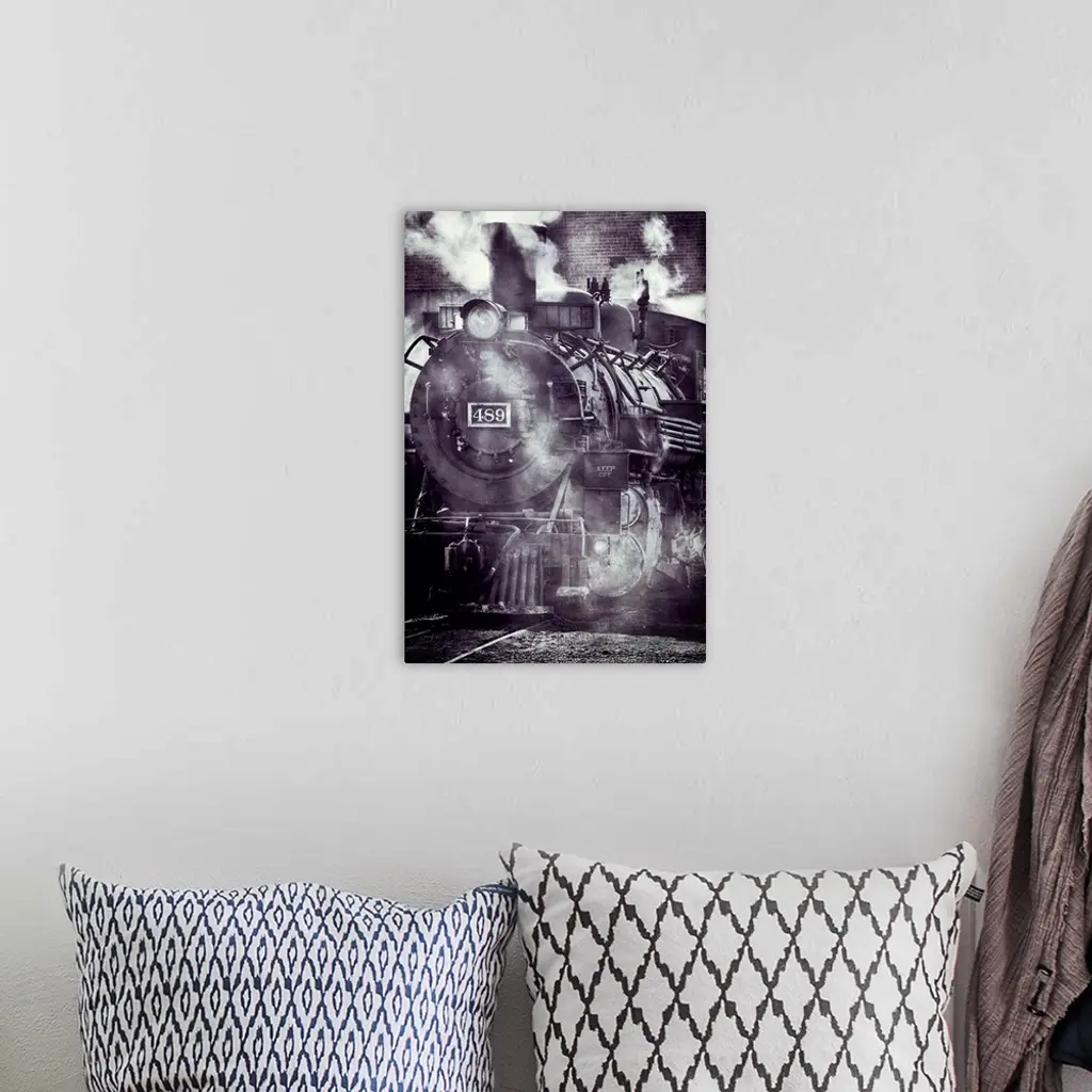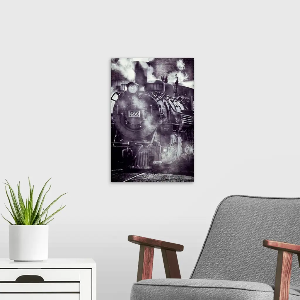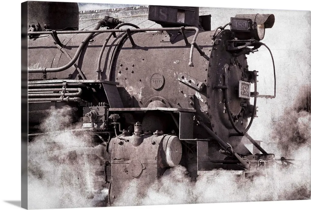 Photograph of a vintage locomotive covered in steam on the train tracks.