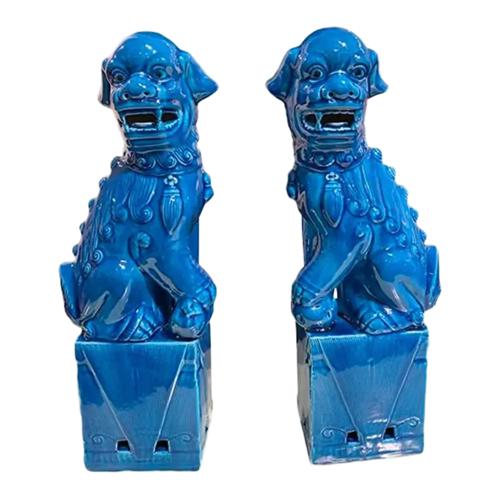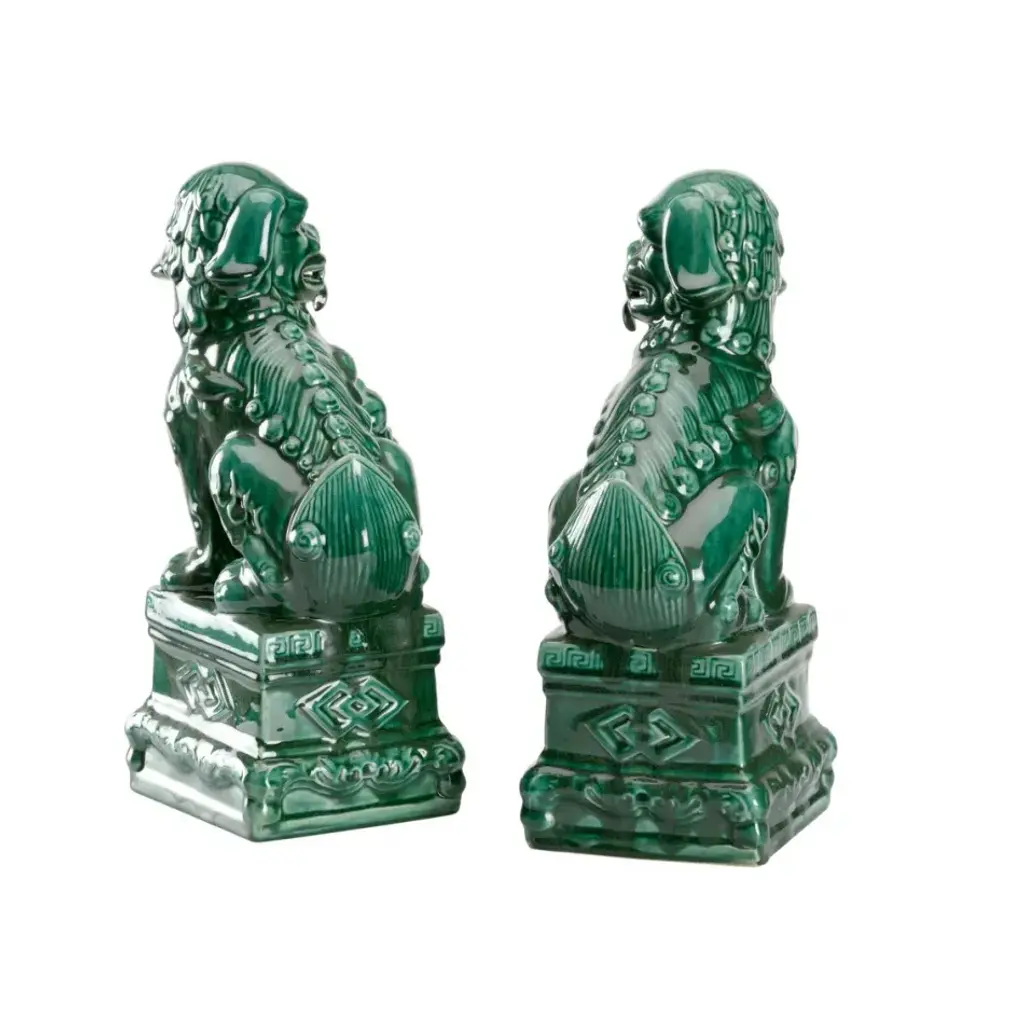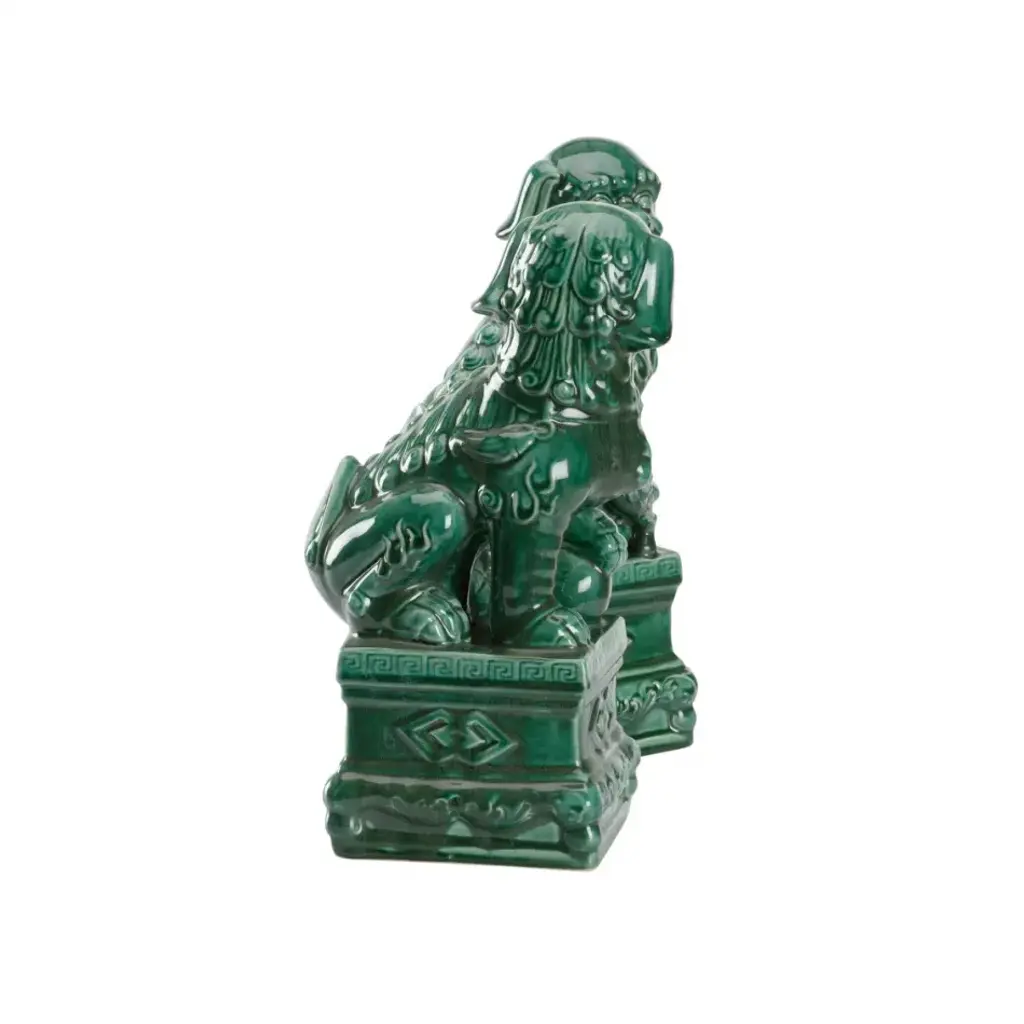 KNOWN IN ANCIENT ASIA AS GUARDIANS OF THE PALACE, FOO DOGS OR CHINESE GUARDIAN LIONS WARD OFF EVIL AND SYMBOLIZE PROSPERITY FOR THE FUTURE. ON TABLETOPS OR IN BOOKCASES, THIS PAIR OF GREEN GLAZED FOO DOGS WILL ADD COLOR AND TRADITION INTO ANY DECOR.