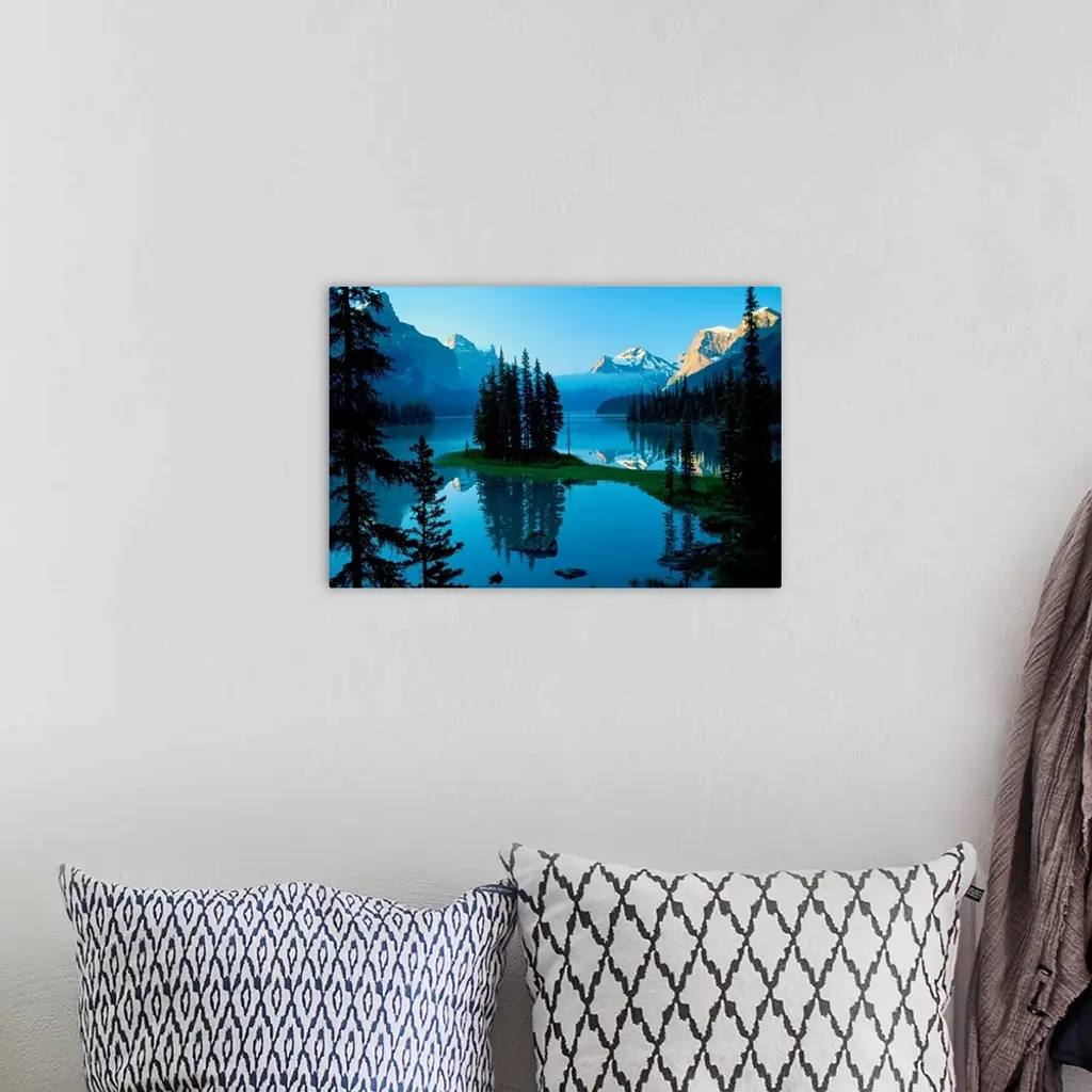 The northern landscape of evergreen trees and mountains reflect on the still waters of a lake in the morning.