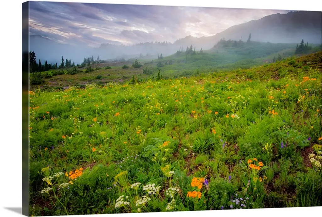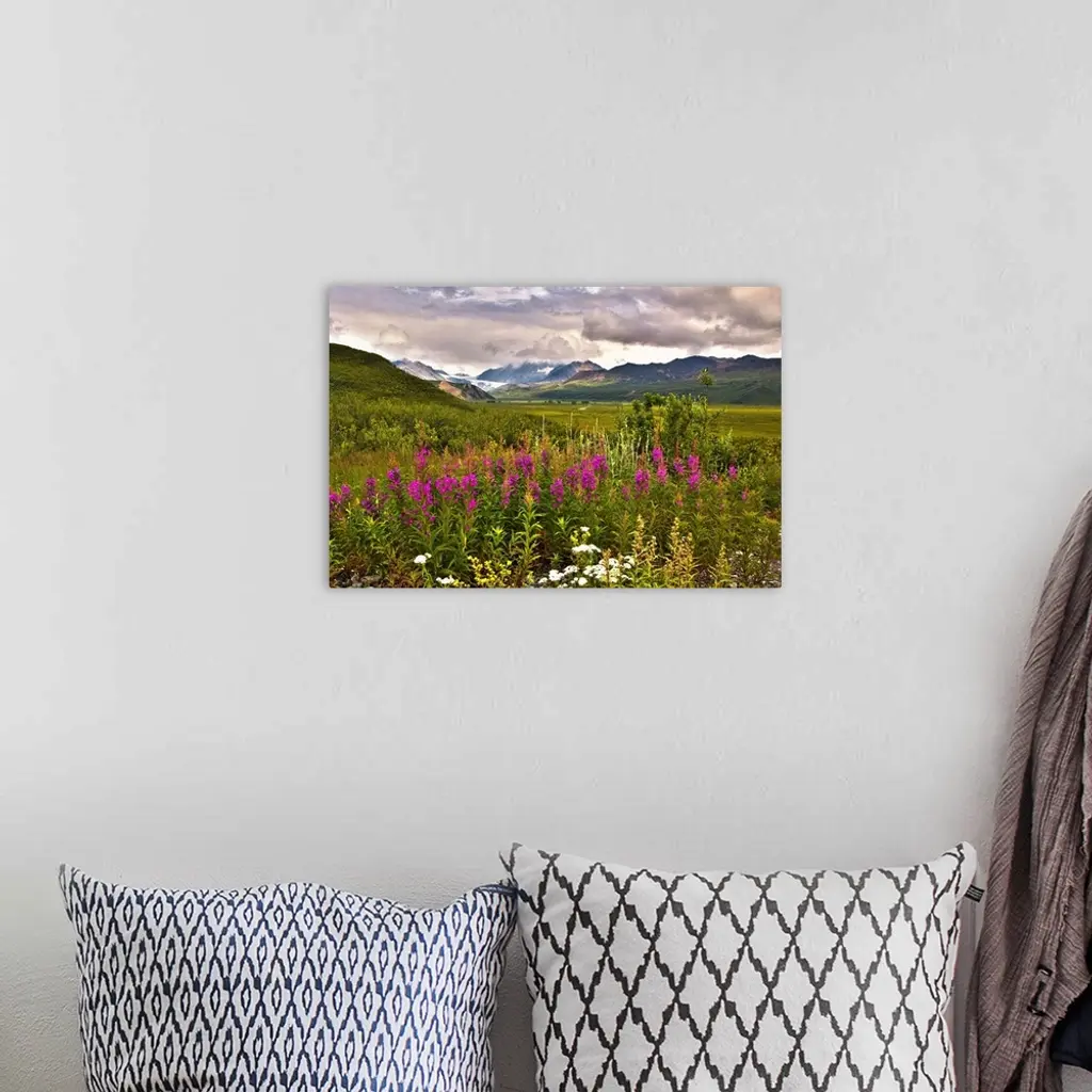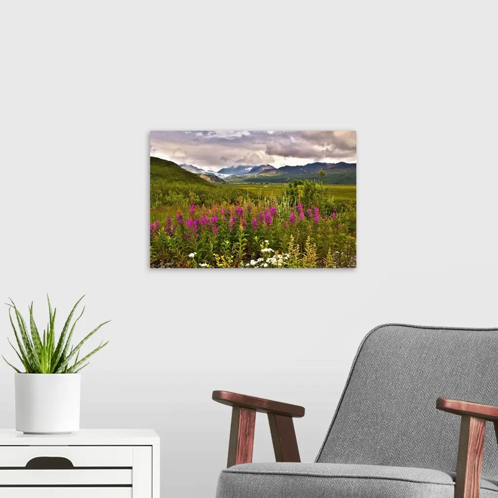 View of the Gulkana Glacier from the Richardson Highway with fireweed in the foreground.