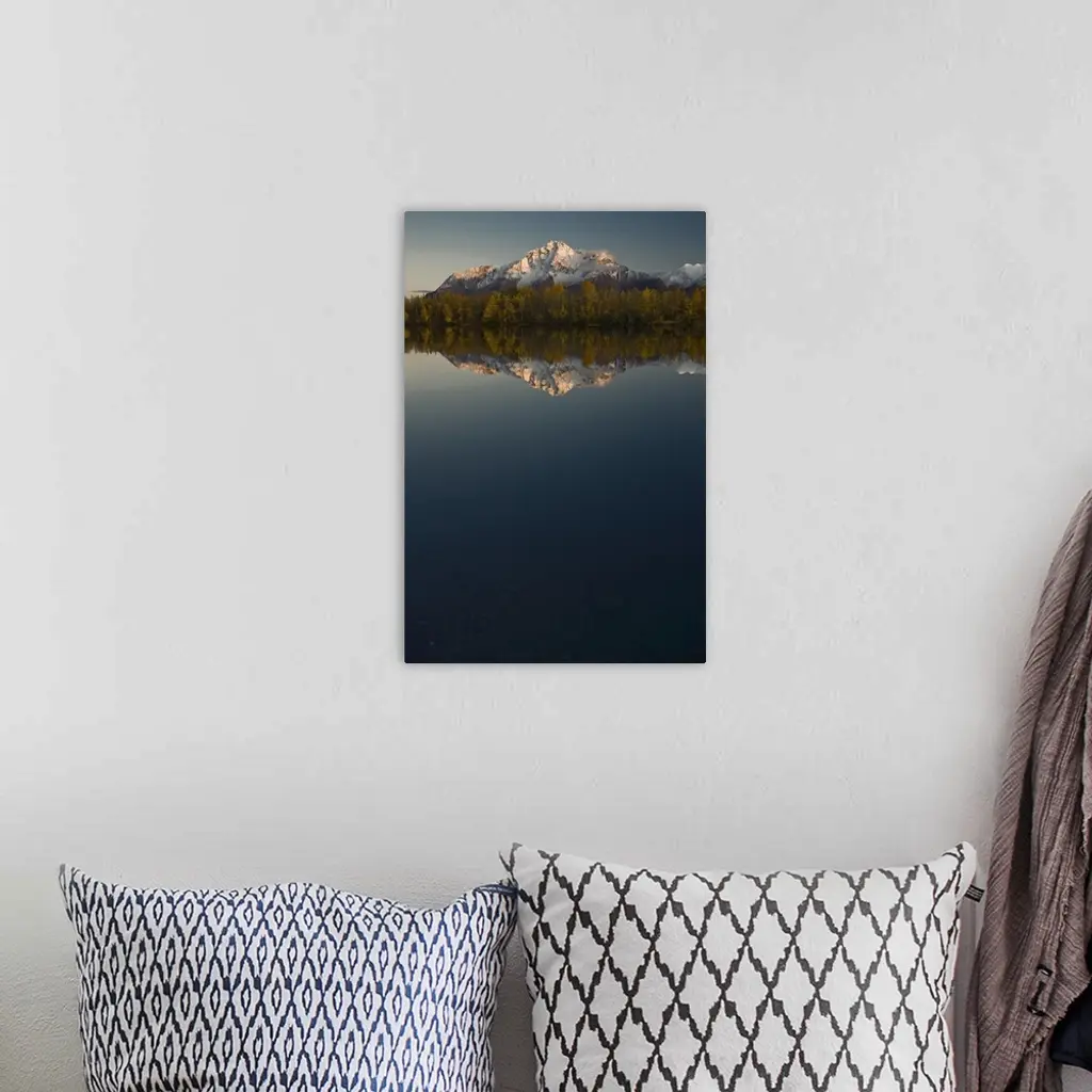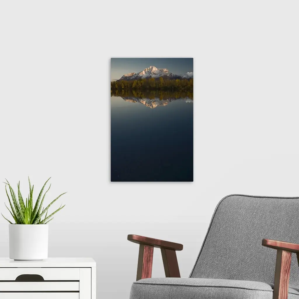 Scenic View Of Pioneer Peak Reflecting In Echo Lake At Sunset, Southcentral, Alaska