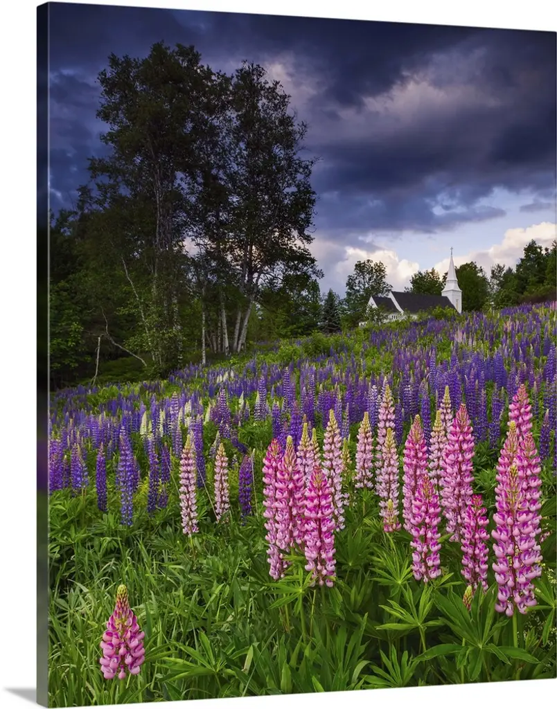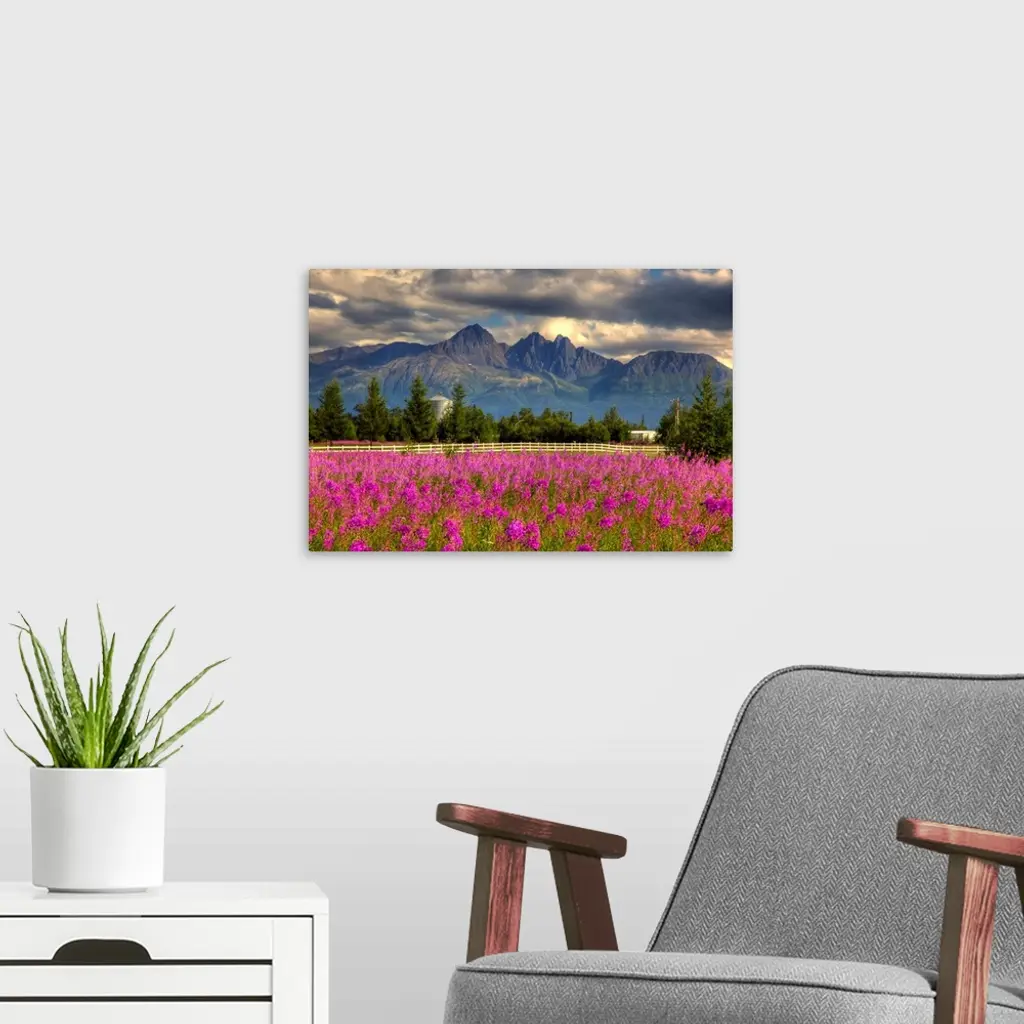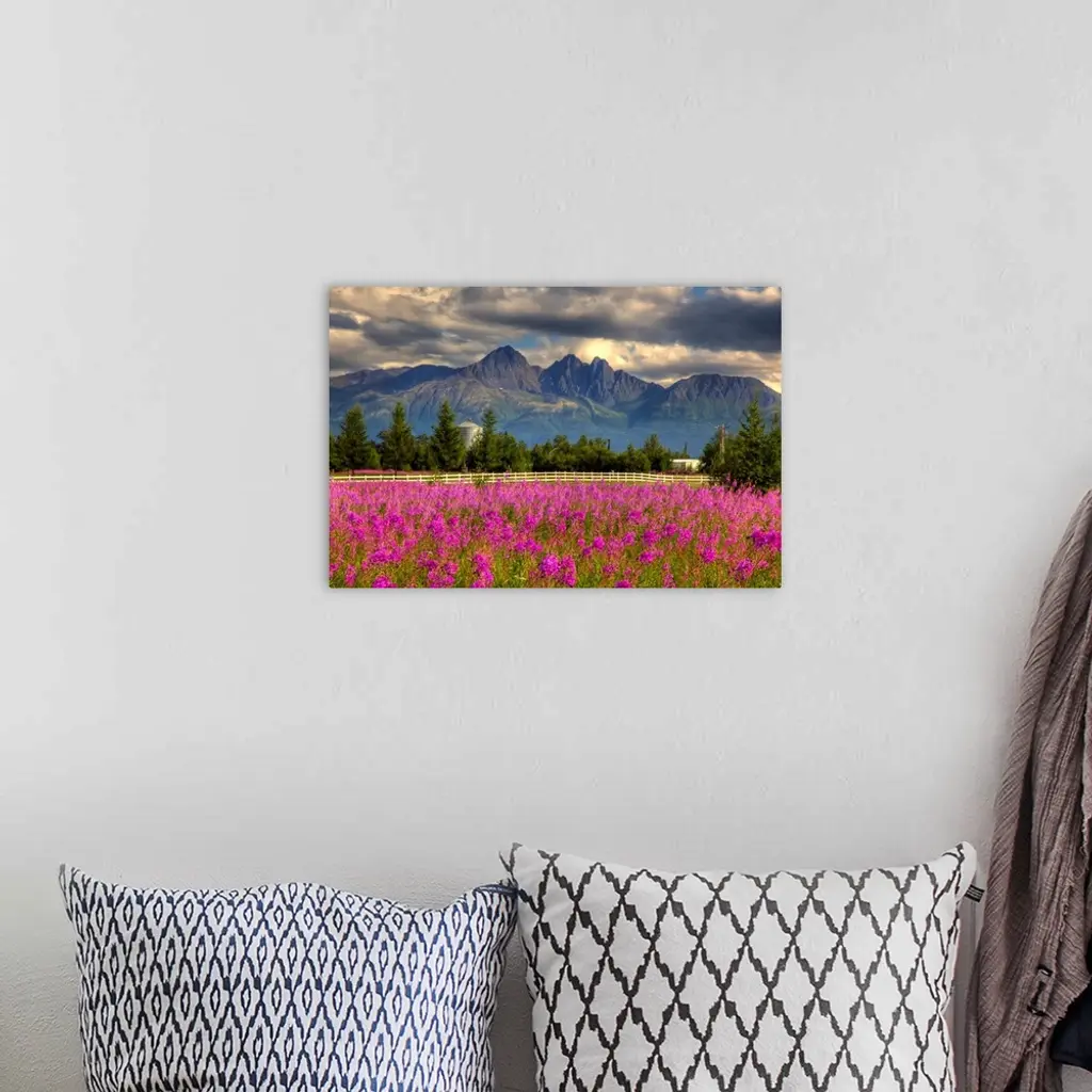 Immense mountains are photographed in the background with grey clouds hanging above. The field in the foreground is covered with bright purple flowers.
