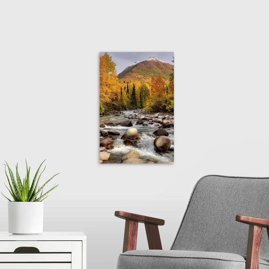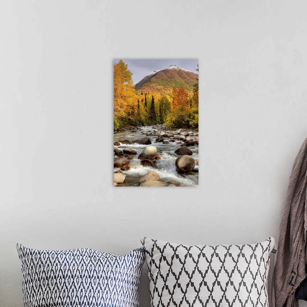 Vertical photograph on a large wall hanging of the rocky Little Susitna River leading toward a large mountain in the background, surrounded by a forest of fall foliage.