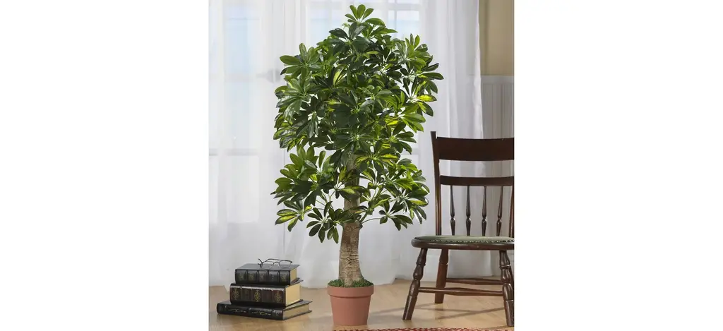 Think green, no matter what the weather is outside. That's how you'll feel when you gaze upon this stunning schefflera tree. With a stout trunk that projects an aura of strength, this tree makes the perfect piece to adorn an entranceway. The trunk gives way to a burst of lush green and yellow leaves that feel every bit as real as they look, with nary a drop of water!