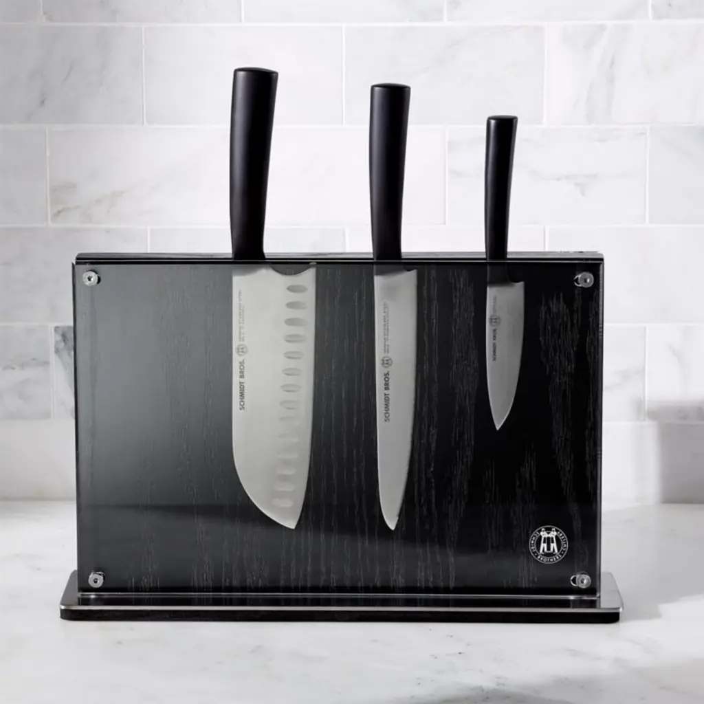 Improving upon knife storage with a simple yet style-conscious design, New York designers the Schmidt Brothers place magnets inside an oak veneer with an acrylic cover to safely store and display knives. The unique, space-saving design stores up to 16 knives.View all Schmidt Brothers products