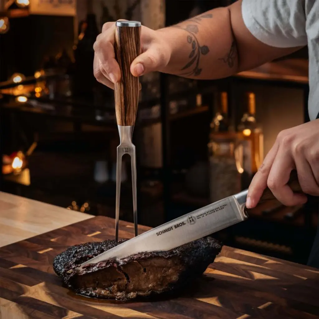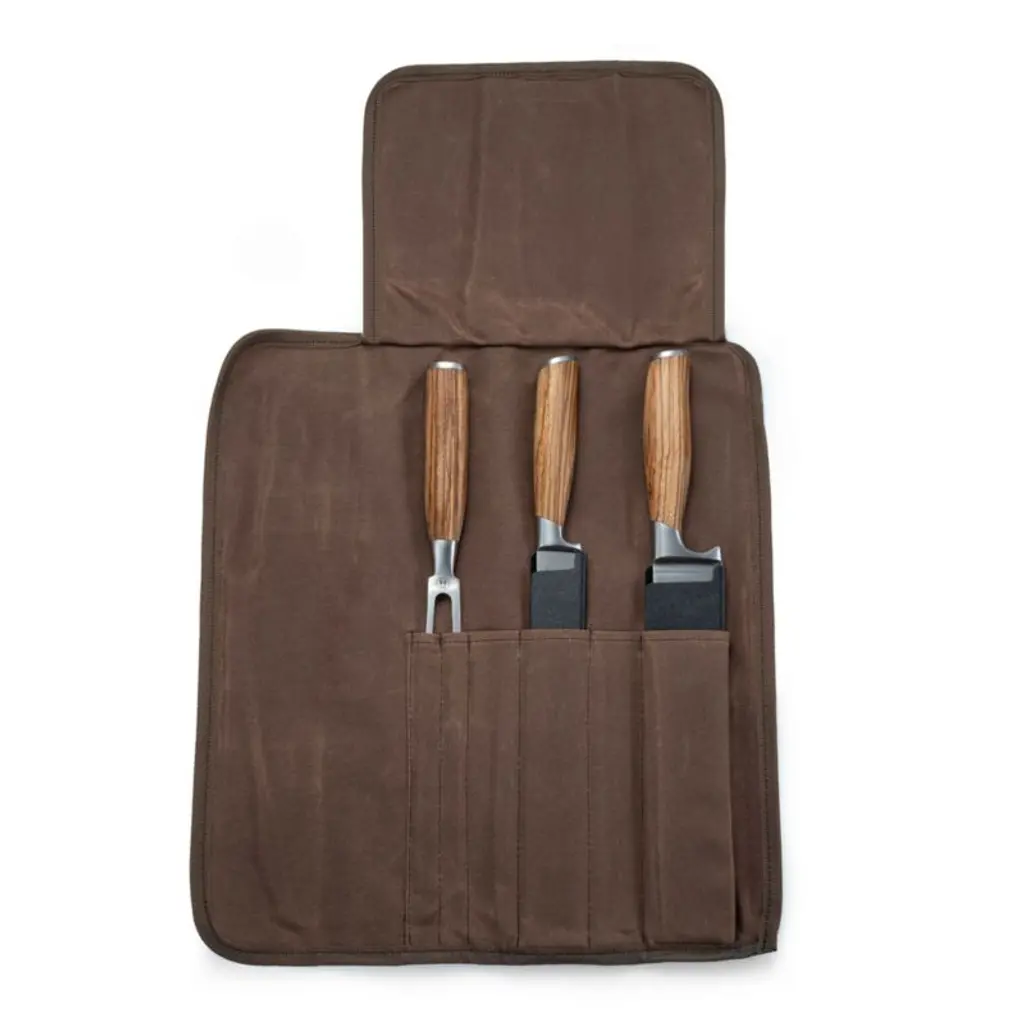 This thoughtful carving set suits the chef on the go. Fitted with stunning zebra wood handles, the stainless steel carving fork and knives carve meat and poultry with ease. Each full-tang, razor-sharp knife blade is protected by a sheath, while the handsome canvas roll makes the set easy to grab and go. A thoughtful gift for your favorite grillmaster or holiday host, this set includes a 6-inch carving fork, 8-inch carving knife and 8-inch chef's knife.