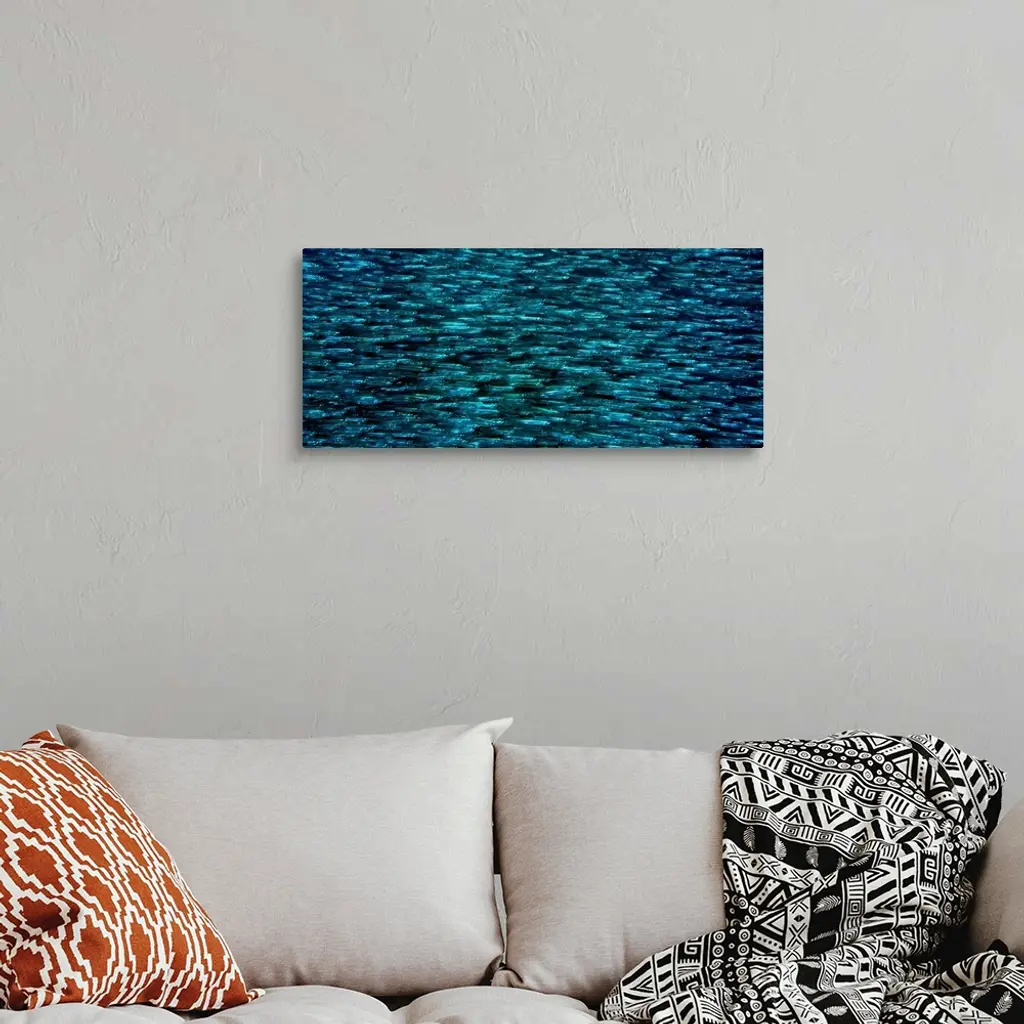 Big, horizontal photograph of a massive school of Silverside fish, gleaming as they swim in the water.
