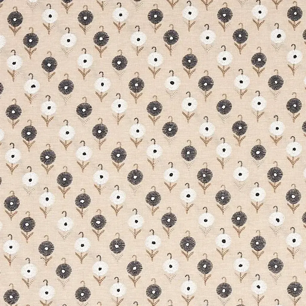 Inspired by a document in our archives, this charming embroidered floral has hand-knotted details and a lovely, refined yet relaxed silk-linen ground. Minimum order of 2 yards. Horizontal Repeat: 17" (43Cm) Vertical Repeat: 11" (28Cm) Match: Straight Content: 40% Linen, 26% Silk, 17% Spun Cotton, 17% Viscose Care Instructions: Dry Cleaning Recommended