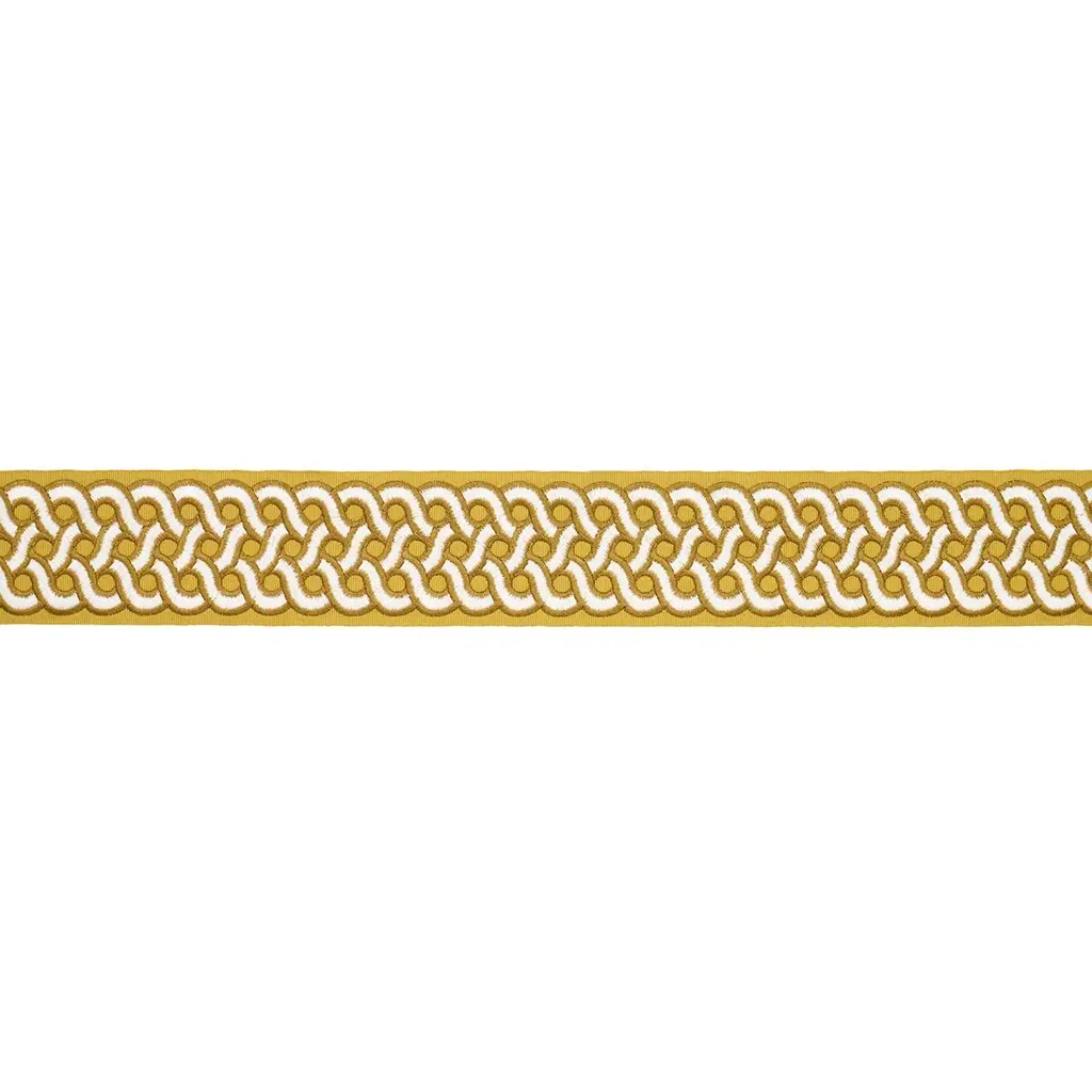 Inspired by Mandeville, a beloved Tim Corrigan Schumacher fabric, this trim's elegant, embroidered design adds sophistication and finesse to upholstery, pillows and window treatments Sold As A 2 Yard Minimum Repeat: STRAIGHT HORZ. 2 1/2" (6CM) VERT. 3/4" (2CM) Care: DRY CLEAN RECOMMENDED