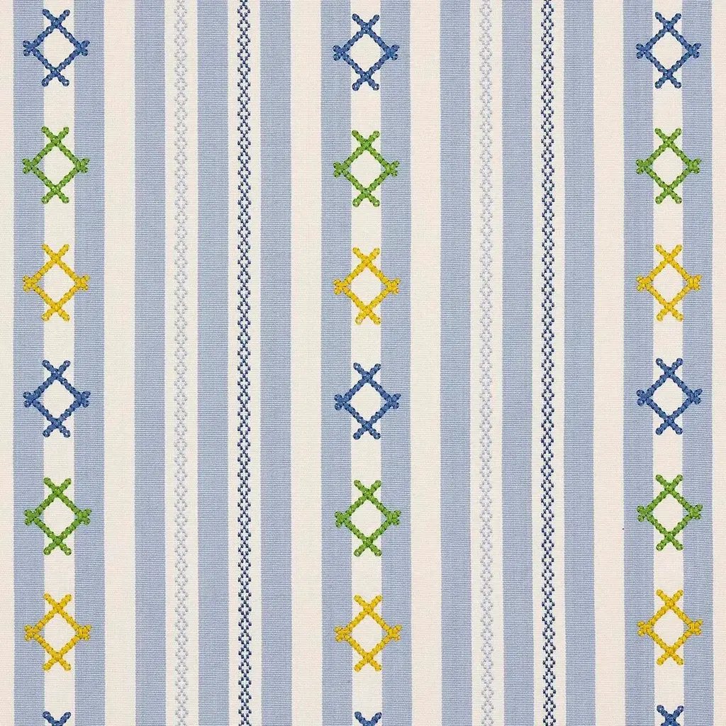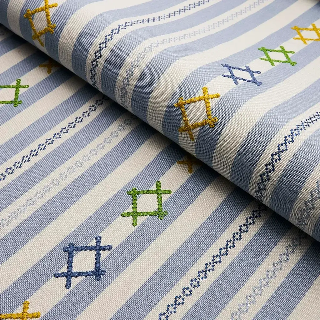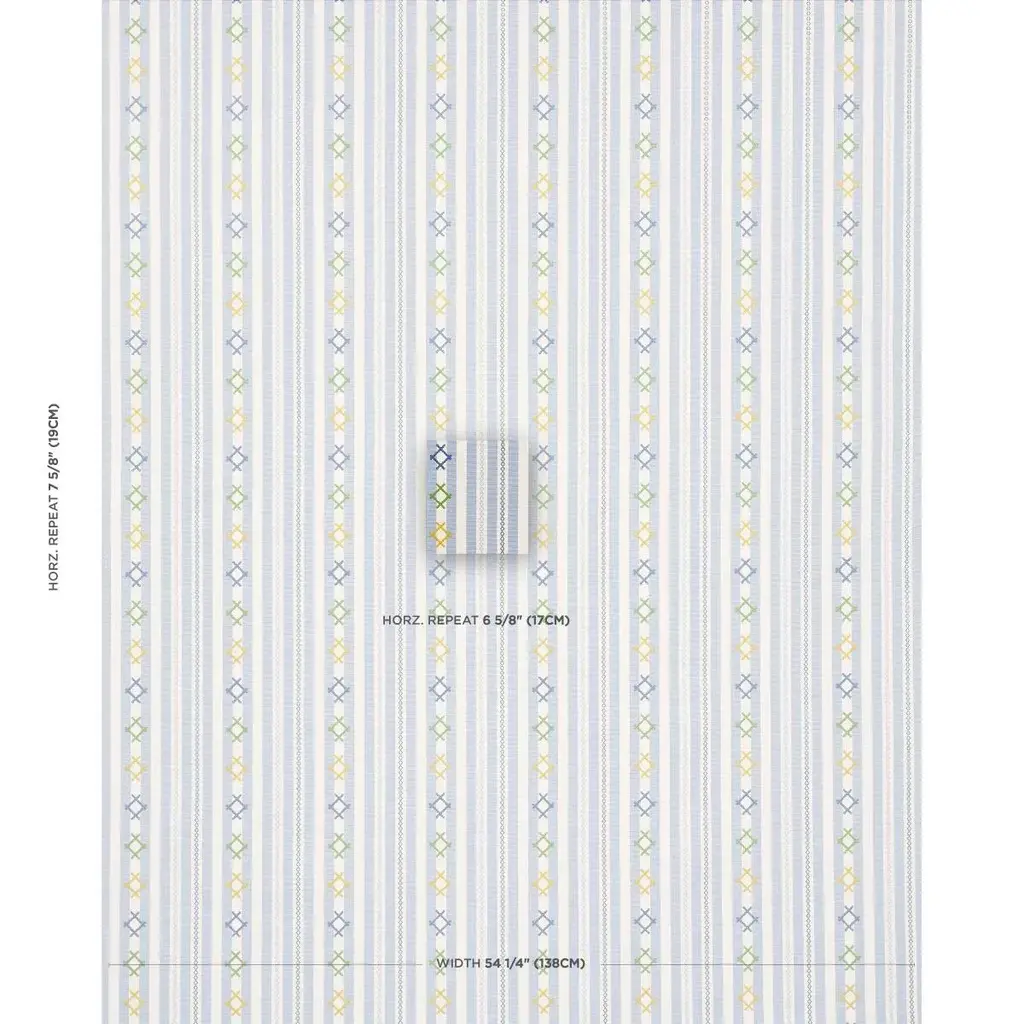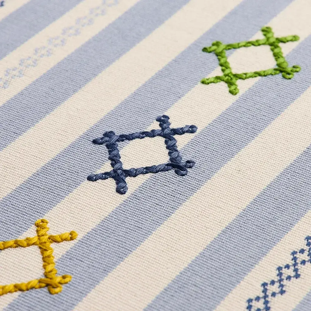 Inspired by Ukrainian needlework, Rhodes Stripe is a woven stripe overlaid with charming, cross-stitched flourishes that take it from ordinary to extraordinary. Sold as a 2-yard minimum Horizontal Repeat: 6.625” Vertical Repeat: 6.625” Match: Straight Content: 88% Cotton Abrasion: Martindale 18,001 Care Instructions: PROFESSIONAL DRY CLEAN