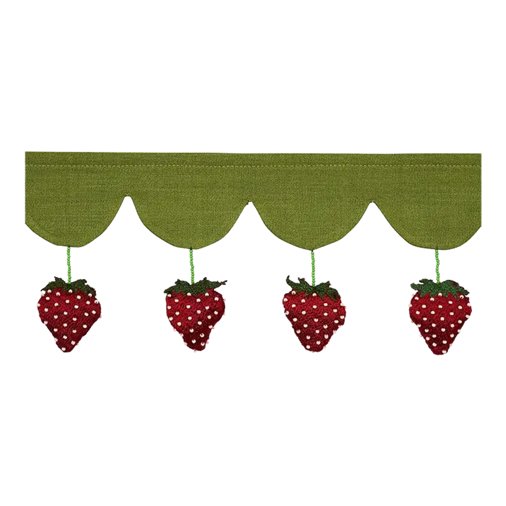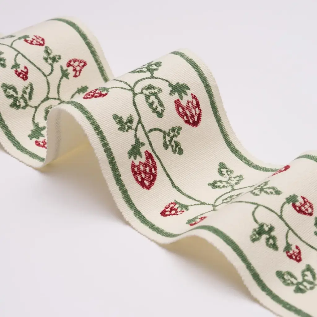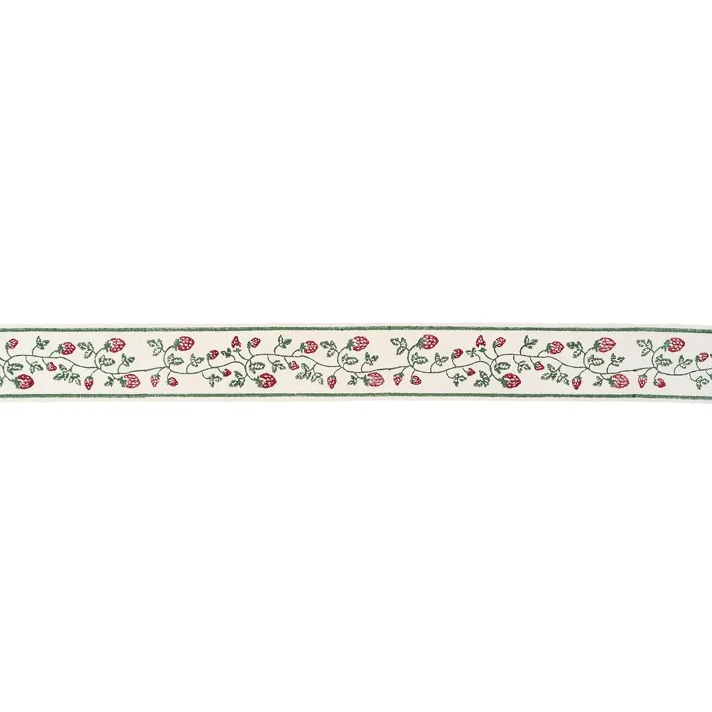 Designed in the U.K. and block-printed by hand in India, Molly Mahon’s Strawberry Trail Hand Block Trim is a delightful 100% cotton tape brimming with English-cottage charm. Perfectly imperfect, this pattern features subtle irregularities that are inherent to its hand-crafted beauty. Sold As: 2 Yards 100% COTTON Repeat Type: STRAIGHT Horizontal Repeat: 3 1/2" (9CM) Vertical Repeat: 10" (25CM)
