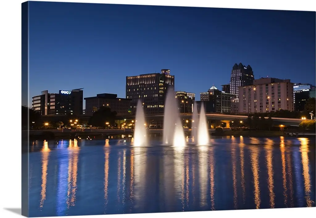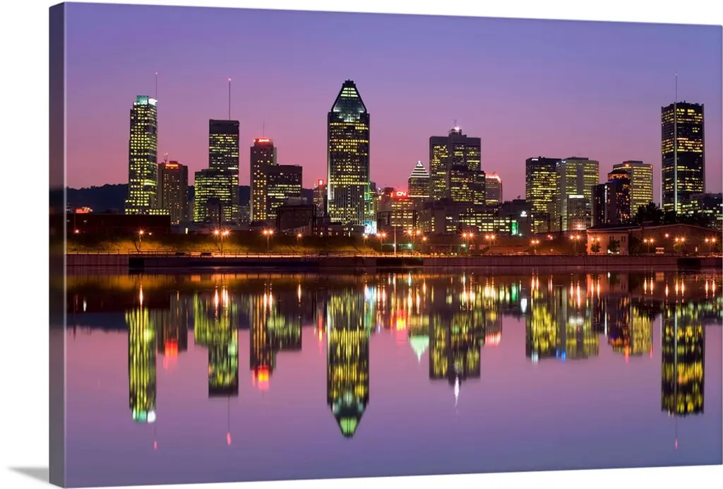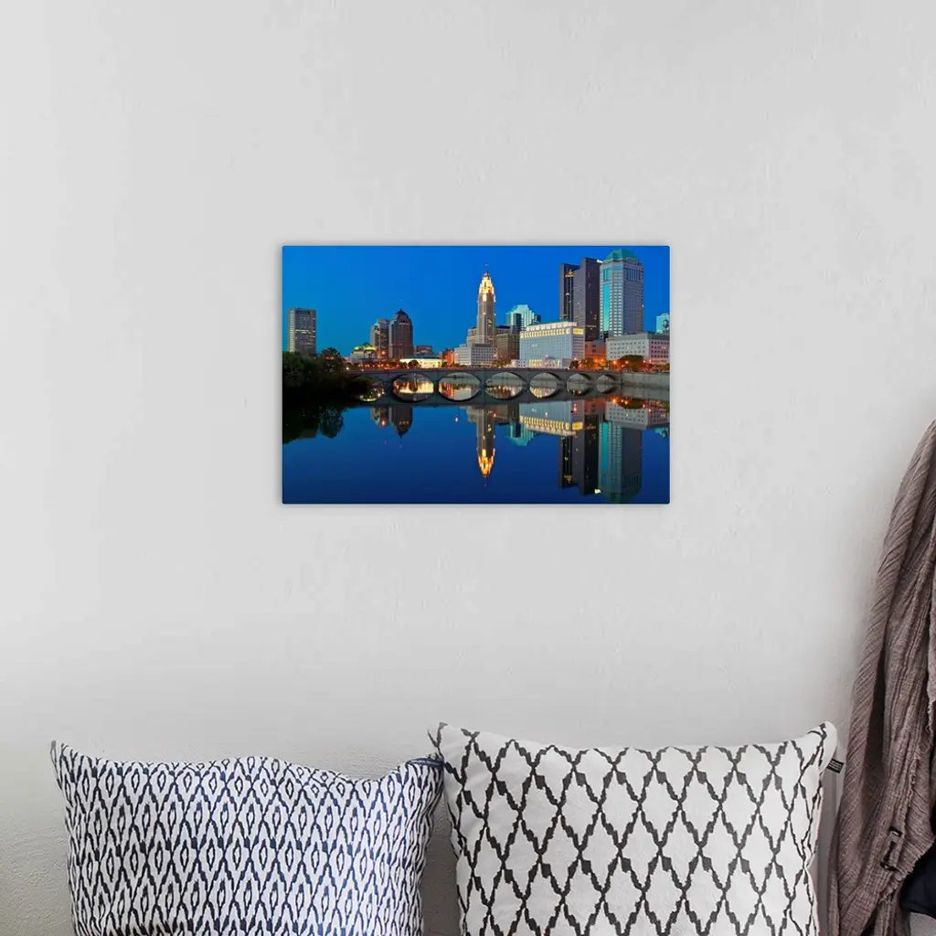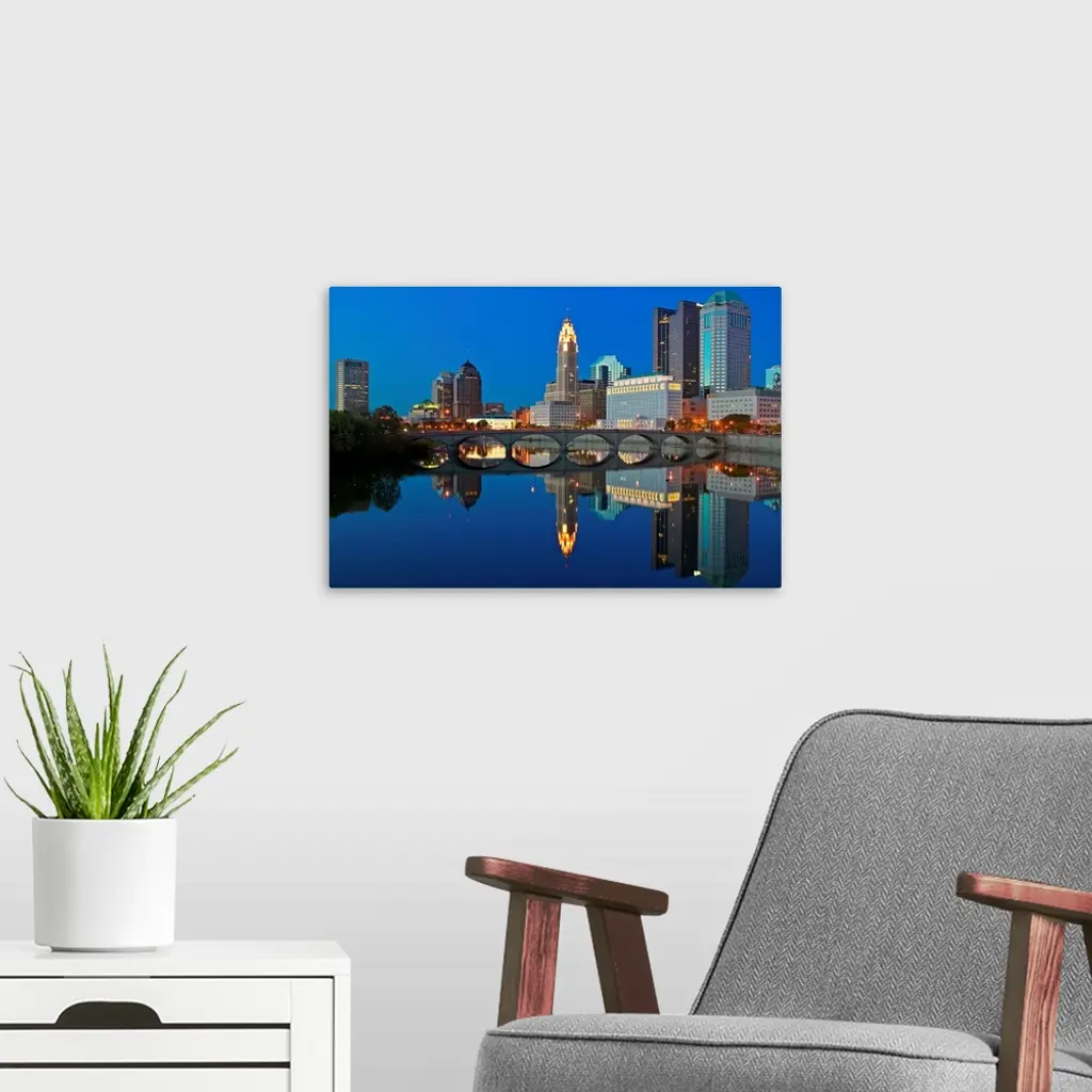 Scioto River and Columbus Ohio skyline at dusk