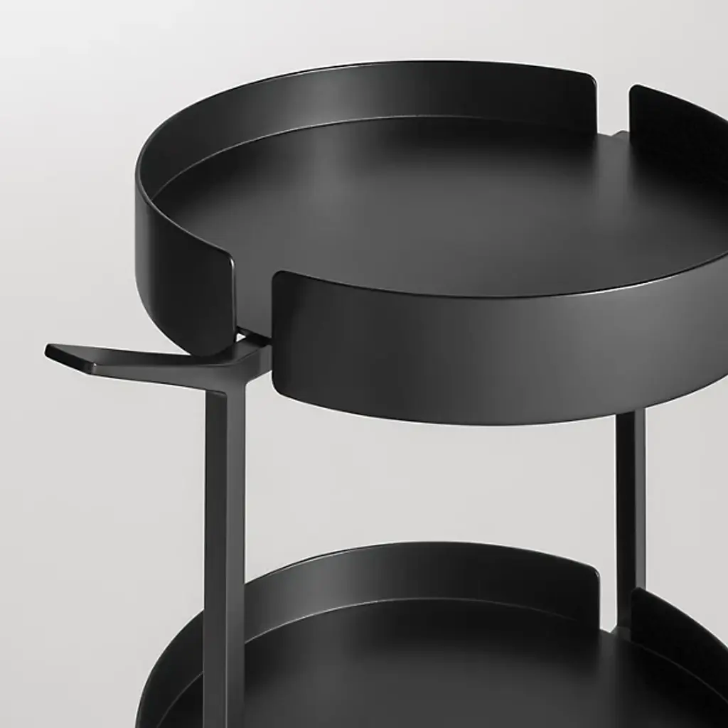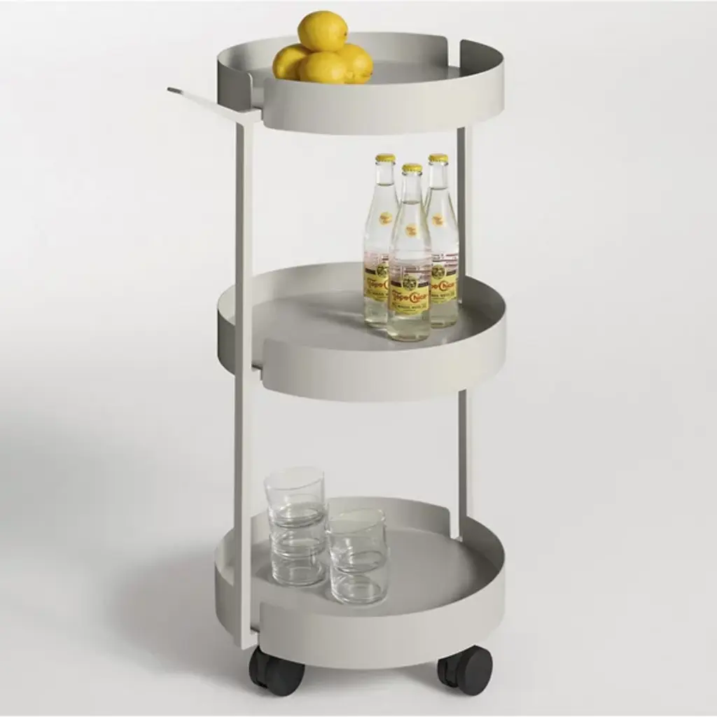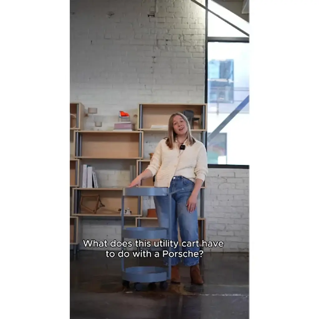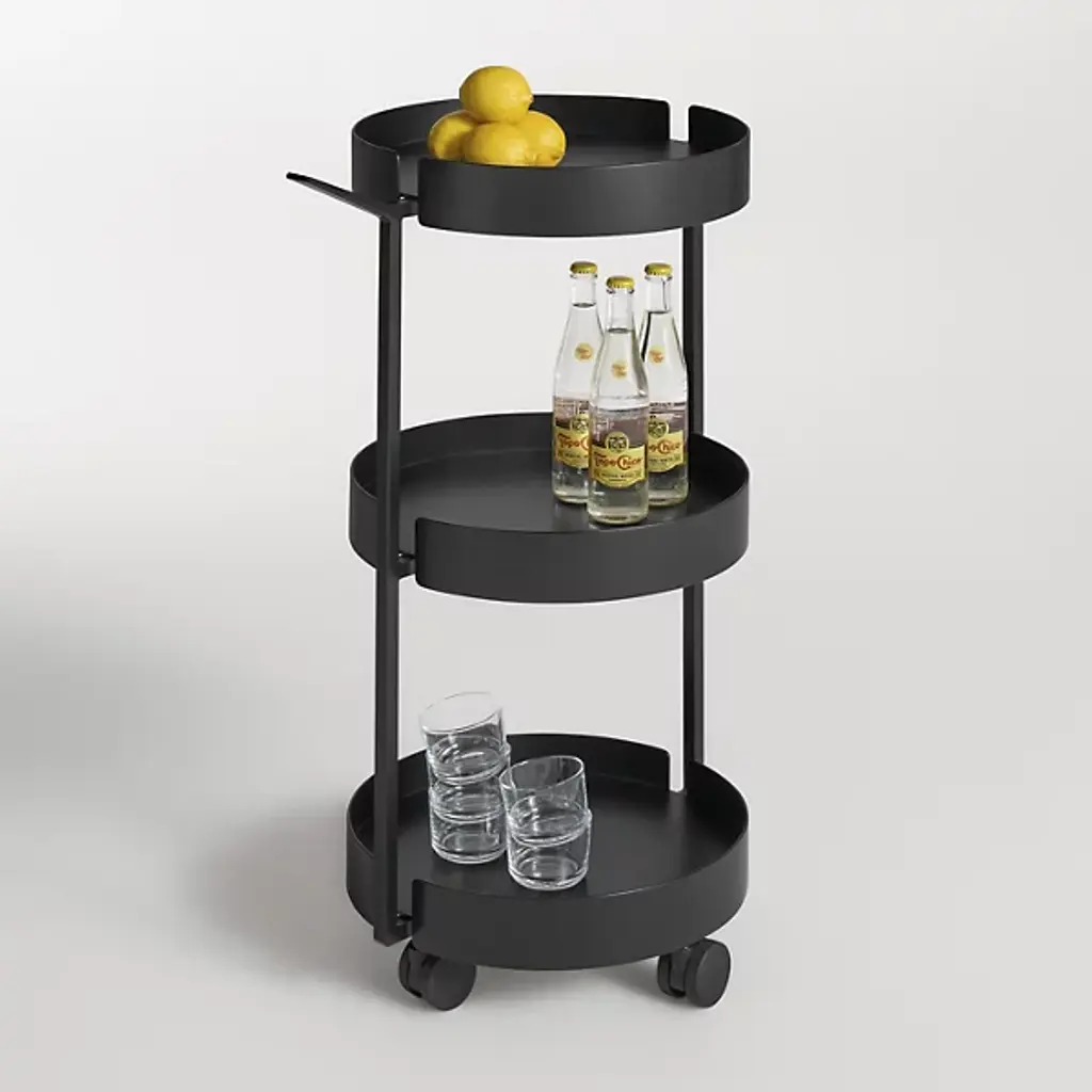 The Scoots McGee Cart from Blu Dot features three steel tiers that provide ample storage and organization options for various needs. Powder-coated steel construction ensures lasting durability, while locking casters allow the cart to stay put when positioned or roll freely when mobility is required. The three-tiered design maximizes vertical storage space efficiently. This utility cart serves multiple functions, from kitchen prep work to office organization or craft room storage. Its compact footprint makes it practical for smaller spaces while still offering generous storage capacity across all three levels for diverse household items.