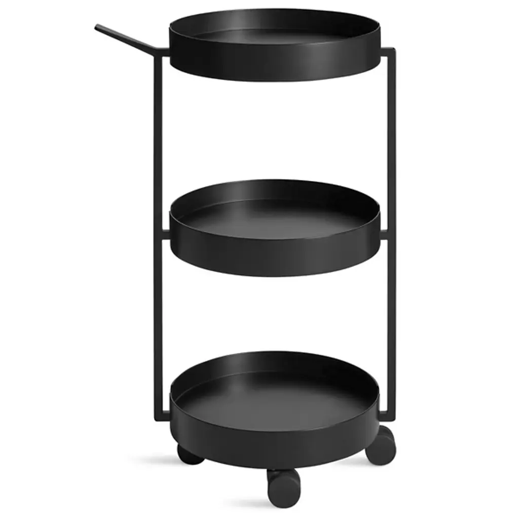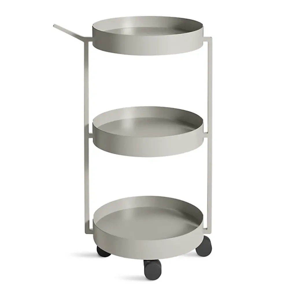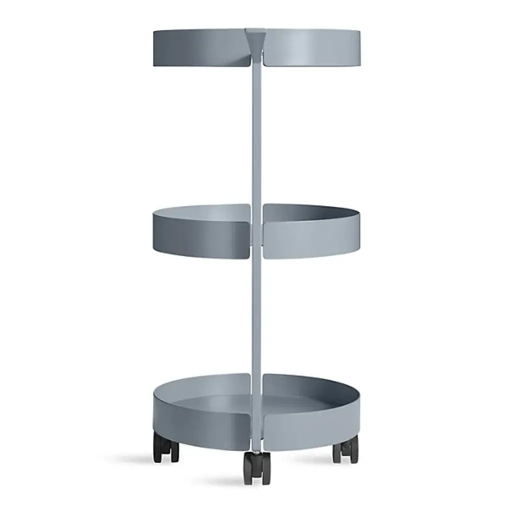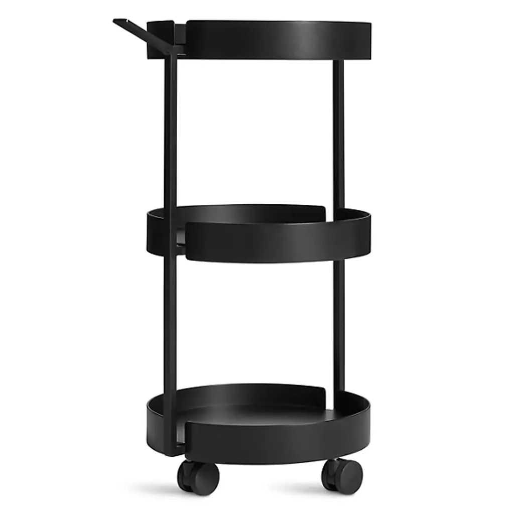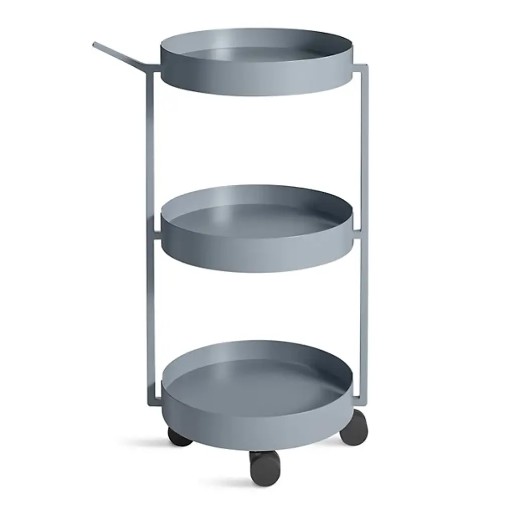 The Scoots McGee Cart from Blu Dot features three steel tiers that provide ample storage and organization options for various needs. Powder-coated steel construction ensures lasting durability, while locking casters allow the cart to stay put when positioned or roll freely when mobility is required. The three-tiered design maximizes vertical storage space efficiently. This utility cart serves multiple functions, from kitchen prep work to office organization or craft room storage. Its compact footprint makes it practical for smaller spaces while still offering generous storage capacity across all three levels for diverse household items.