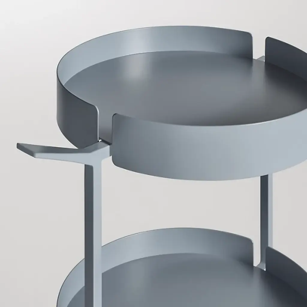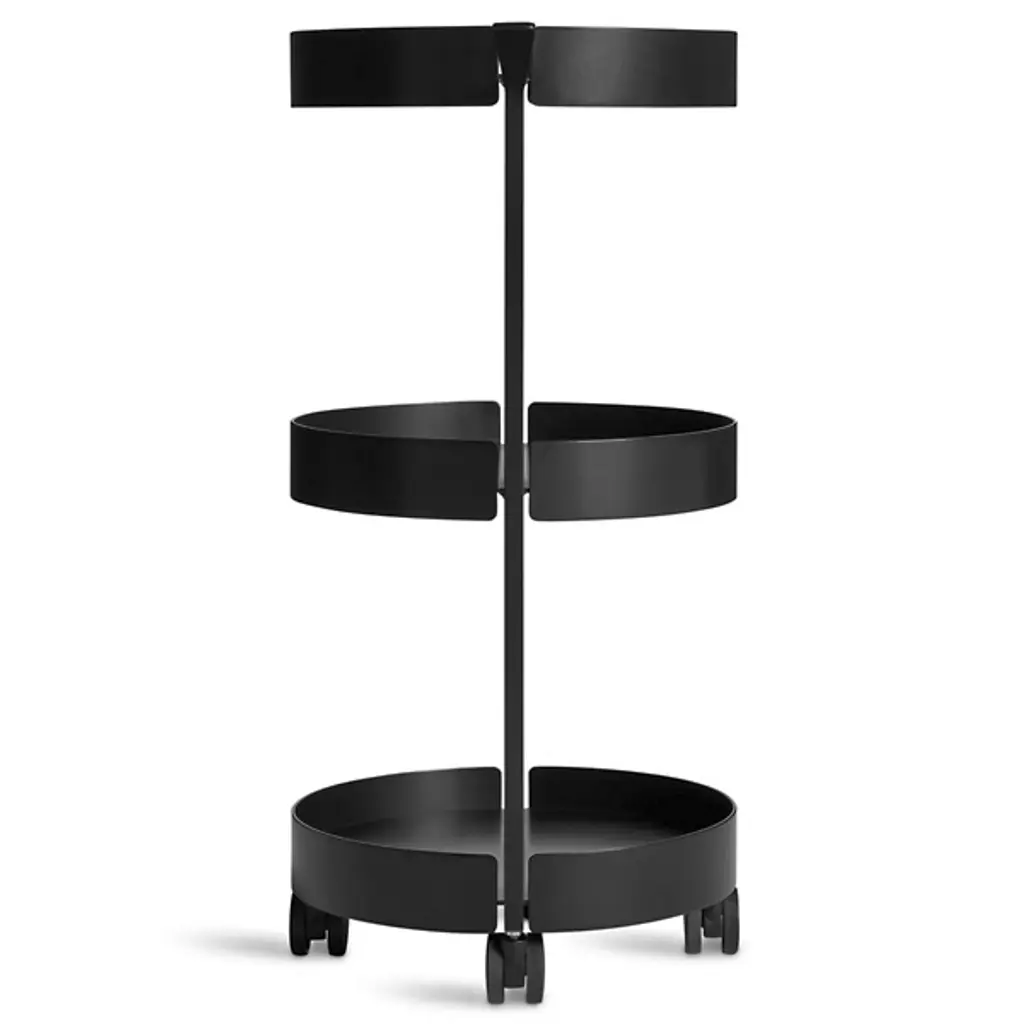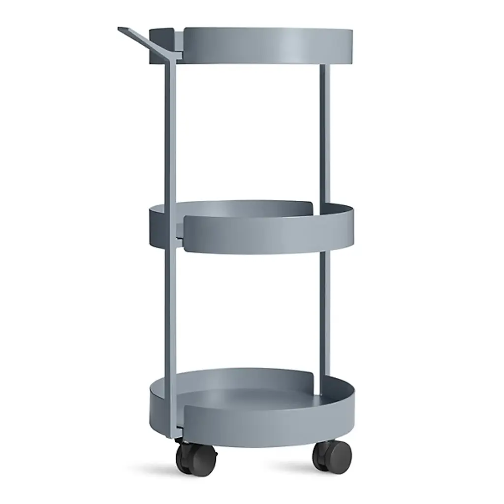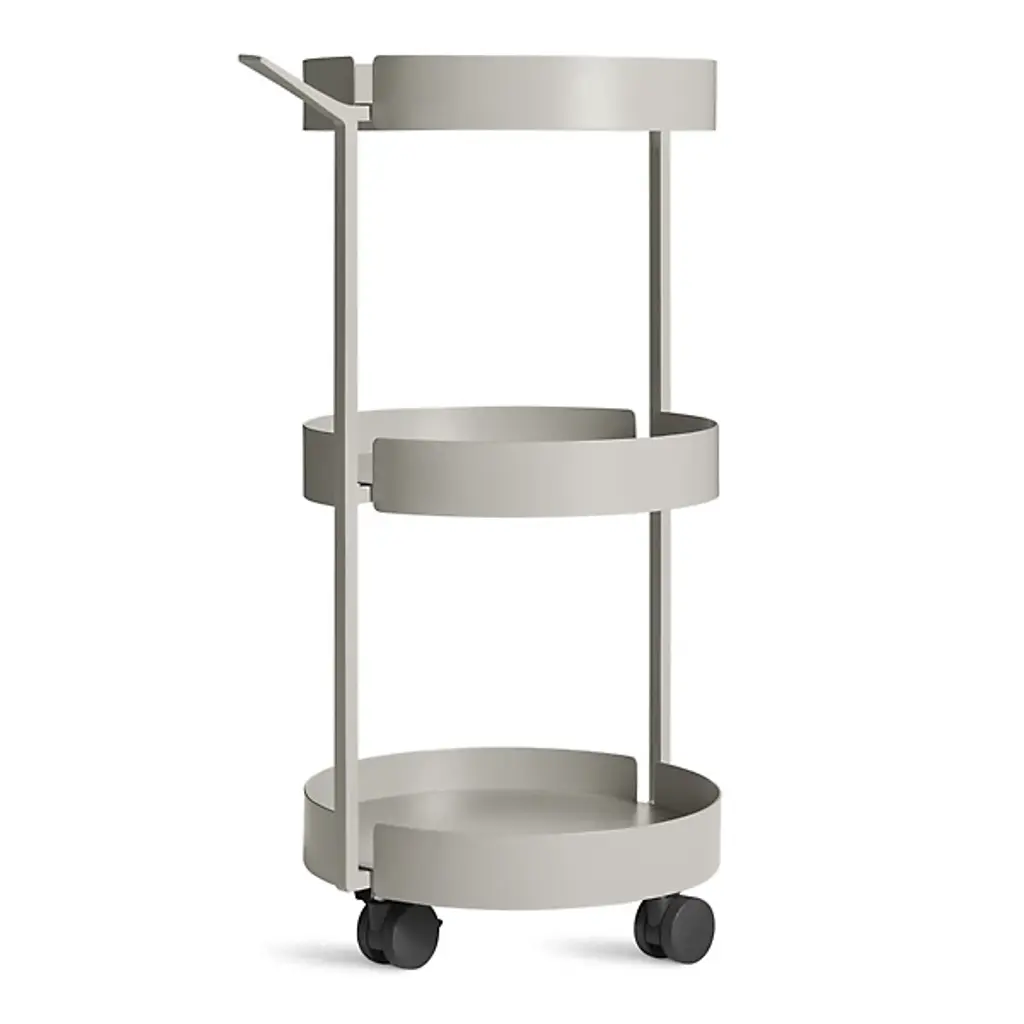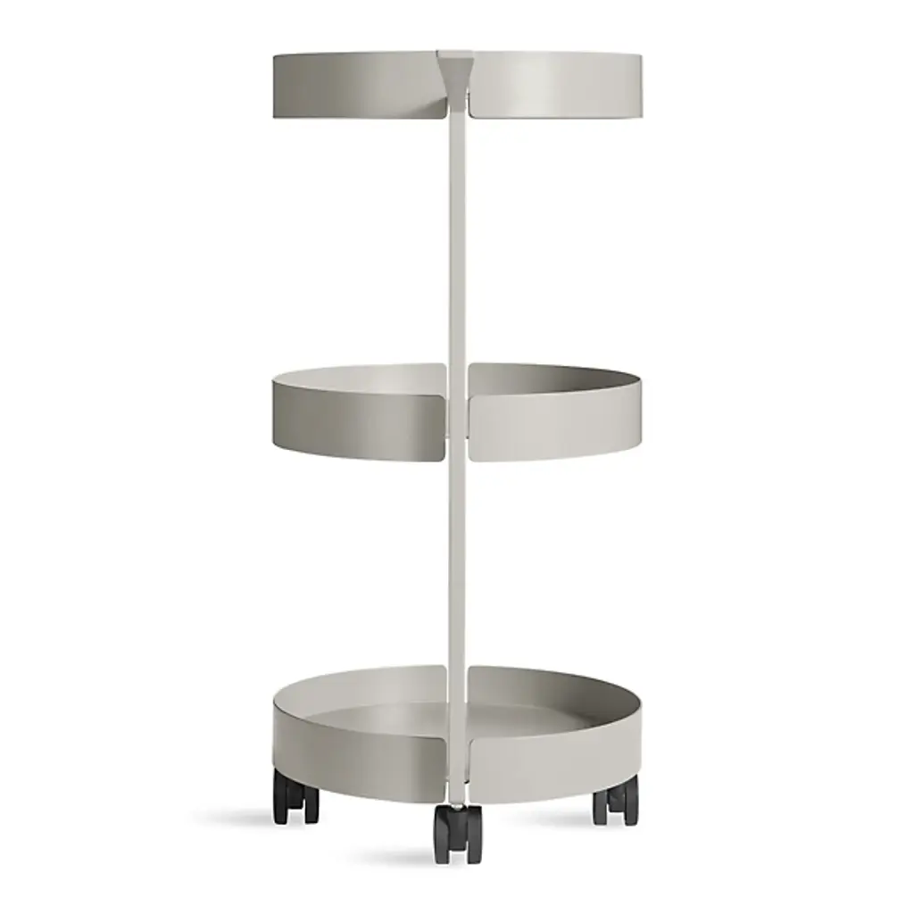 The Scoots McGee Cart from Blu Dot features three steel tiers that provide ample storage and organization options for various needs. Powder-coated steel construction ensures lasting durability, while locking casters allow the cart to stay put when positioned or roll freely when mobility is required. The three-tiered design maximizes vertical storage space efficiently. This utility cart serves multiple functions, from kitchen prep work to office organization or craft room storage. Its compact footprint makes it practical for smaller spaces while still offering generous storage capacity across all three levels for diverse household items.