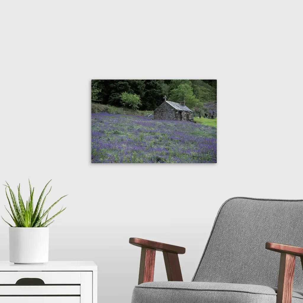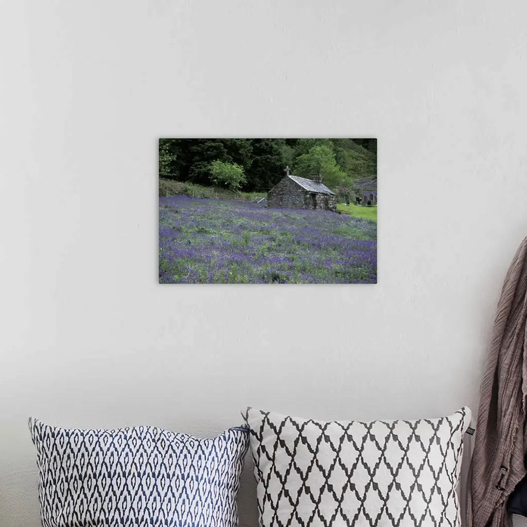 Europe, Scotland, Highlands, Oban.Church and heather; weathered stone structures are common in the Scottish Highlands