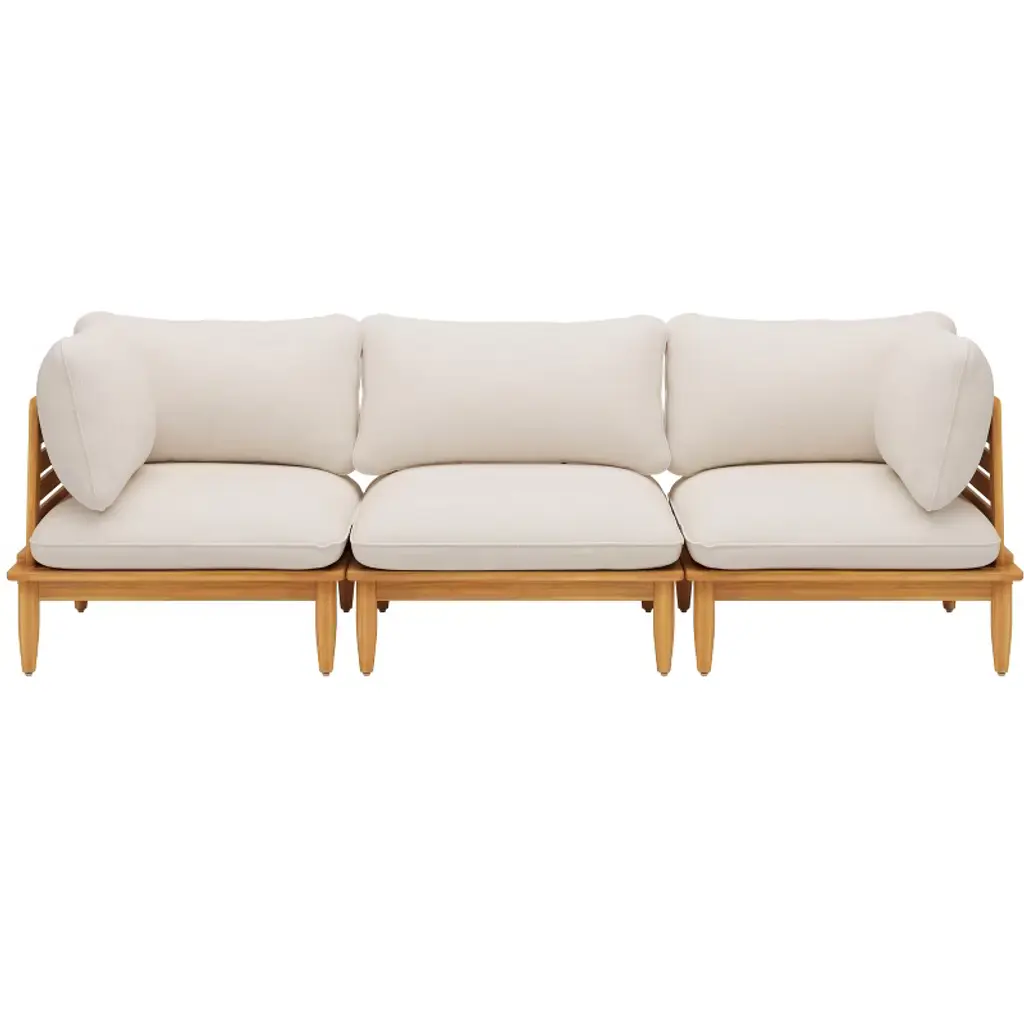 Transform your outdoor space into a cozy, inviting retreat with this 3-piece sofa. Built from sturdy acacia wood, the frame offers lasting durability and showcases a rich, natural grain that adds organic warmth to your surroundings. Soft, light beige cushions provide plush comfort and a relaxed, inviting aesthetic. With clean lines and neutral tones, this set effortlessly blends into a range of styles making it ideal for everyday lounging, casual get-togethers, or cozy family moments. Included: One (1) Left Arm Sofa+One (1) Right Arm Sofa+One (1) Armless Sofa Dimensions: Armless Sofa: 31.80"W x 31.80"D x 25.75"/31.50"H Left/Right Sofa: 31.80"W x 31.80"D x 25.75"/31.50"H Seat Height: 10.25" Seat Cushion Thickness: 6.00"