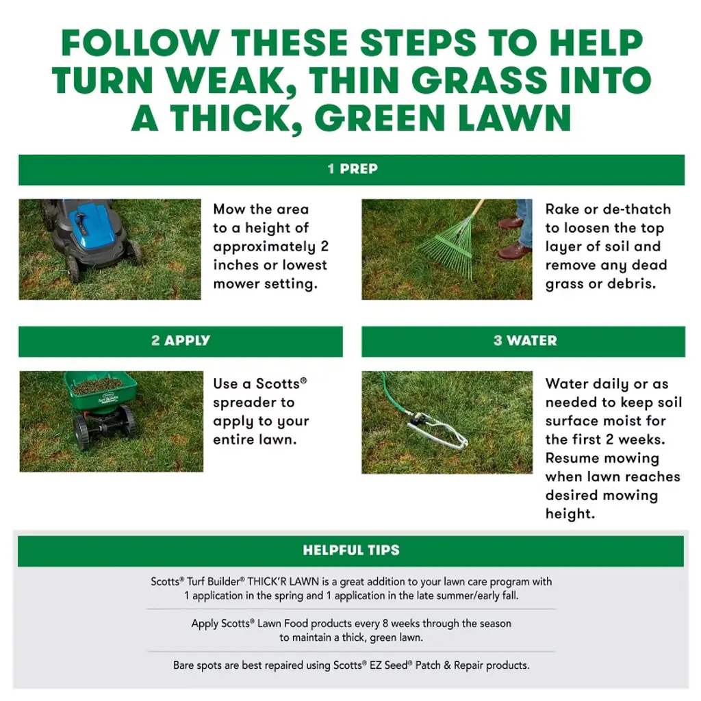 Scotts® Turf Builder® THICK'R LAWN® Sun & Shade has everything you need to help turn your thin lawn into a thicker, greener lawn. The 3-in-1 solution is formulated with grass seed to fill gaps in current lawn, fertilizer to feed, green, and thicken new and existing grass, and soil improvers to encourage stronger root development. These three components work together to help you get up to a 50% thicker lawn with just one application (subject to proper care; results may vary based on current condition of lawn). Scotts® Turf Builder® THICK'R LAWN® Sun & Shade is a great addition to your lawn care program with one application in the spring and one application in the late summer or early fall. We recommend using a Scotts® spreader to apply this product (please refer to spreader settings on product label). Water daily or as needed to keep soil surface moist for the first 2 weeks. One 12 lb. bag of Scotts® Turf Builder® THICK'R LAWN® Sun & Shade covers 1,200 sq. ft.