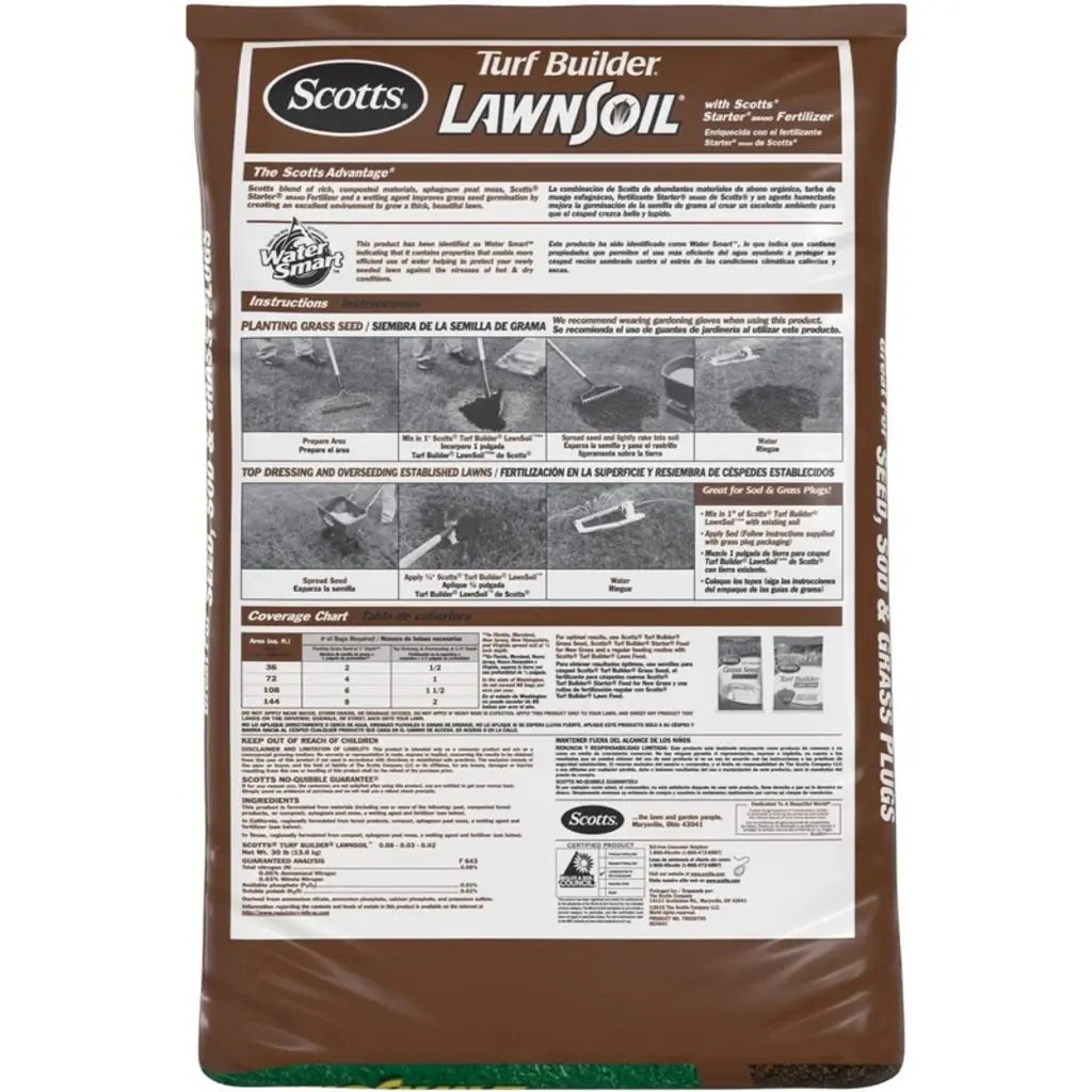 Scott's Turf Builder Lawn Soil is a specially formulated product designed for lawn repair and over-seeding. This soil is ideal for use with seed, sod, and grass plugs, and is a Water Smart product, which helps protect newly seeded lawns during hot and dry conditions. It promotes grass growth up to 50% thicker than native soil, providing better moisture retention and improved germination. The included Scotts Starter Brand Fertilizer delivers essential nutrients, encouraging faster and stronger seedling growth while supporting a robust root system. For best results, it is recommended to use with Scotts Turf Builder Grass Seed. This product is an essential choice for anyone looking to create a thicker, greener lawn.