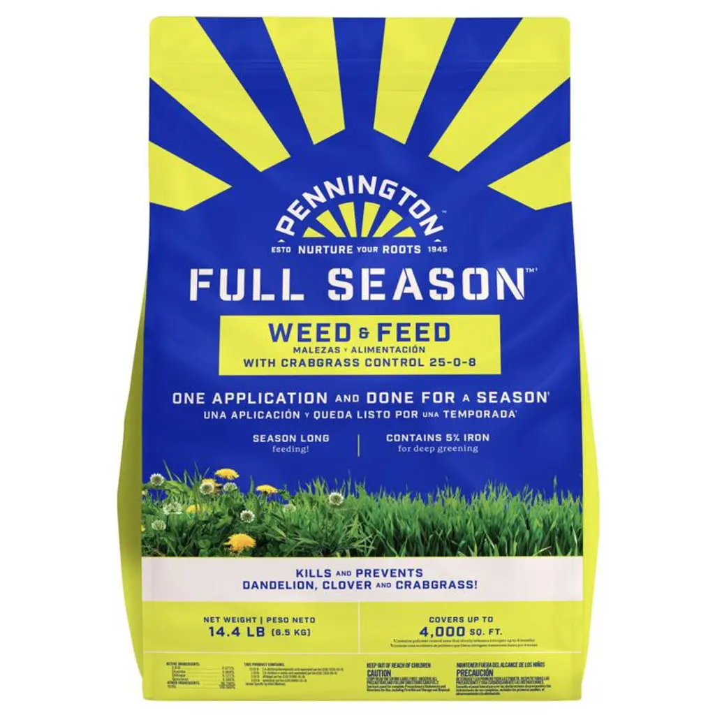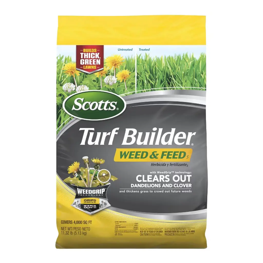 It's time to put a stop to weed-infested lawns - take action with Scotts® Turf Builder® Weed & Feed5. This weed killer and lawn fertilizer utilizes WeedGrip™ Technology to grip onto and kill the weeds you see and the ones you don't. It controls over 50 listed weeds, including clover, dandelion, and plantain. In addition, this product feeds to thicken grass to crowd out future weeds. Apply Scotts® Turf Builder® Weed & Feed5 when weeds are actively growing and daytime temperatures are consistently between 60°F and 90°F. Make sure your grass is wet from dew or watering, as this helps particles adhere to weed leaves to produce the best results. We recommend using a Scotts® spreader to apply this product (please refer to spreader settings on product label). Do not water your lawn for 24 hours after application or apply if rain is expected within the next 24 hours. Do NOT use on Creeping Bentgrass, St. Augustinegrass (including Floratam), Dichondra, Carpetgrass, or Lippa lawns. One 33.95 lb. bag of Scotts® Turf Builder® Weed & Feed5 covers 12,000 sq. ft.