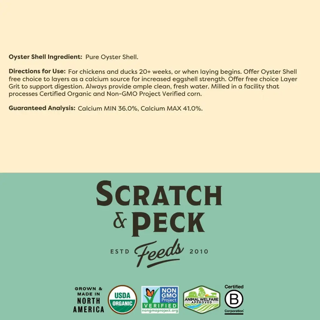 Crushed Oyster Shell provides additional calcium to increase eggshell strength for layers. Calcium provided by the Oyster Shell is absorbed by chickens to build strong egg shells whereas Grit stays in the gizzard to contribute to digesting whole grains and Oyster Shell. Our balanced Layer Feed formulas contain the ideal amount of calcium for most birds. Factors such as weather and environment are uncontrollable and may affect how well your birds process and store nutrients like calcium.