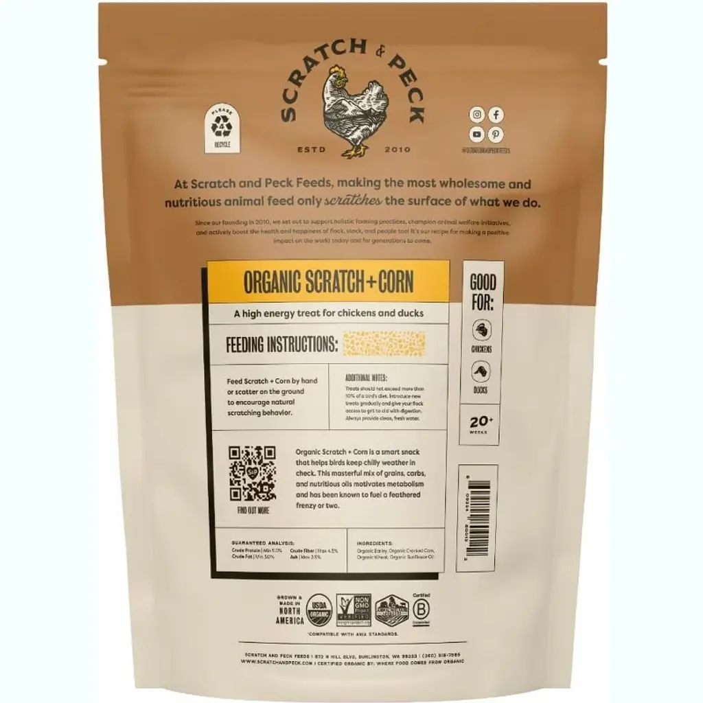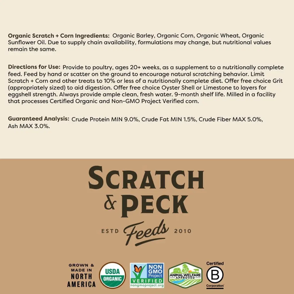 Scratch and Peck Soy Free Scratch n' Corn is made using Certified Organic whole grains. We use a blend of Pacific Northwest Organic Corn, Organic Wheat and Organic Barley. Feed as a treat from your hand or scatter on the ground! Scratch n’ Corn is an excellent treat choice for cold weather. The added corn is an easily digestible carbohydrate that helps your birds generate energy.